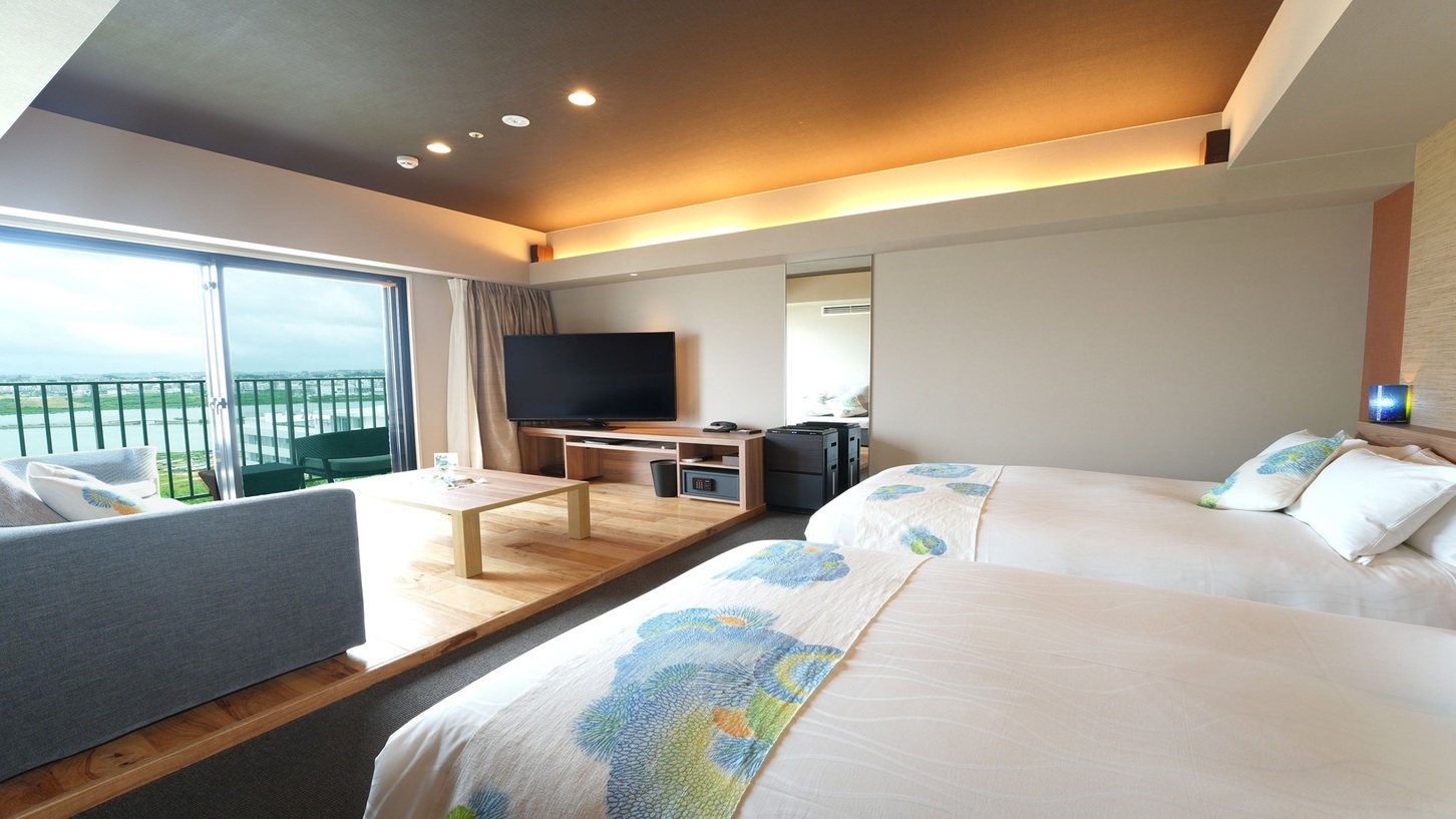 源泉かけ流し露天風呂が付いた洋室のお部屋。クワブフロアでワンランク上の寛ぎを。 部屋の広さはバルコニーを含んだ表記となっております