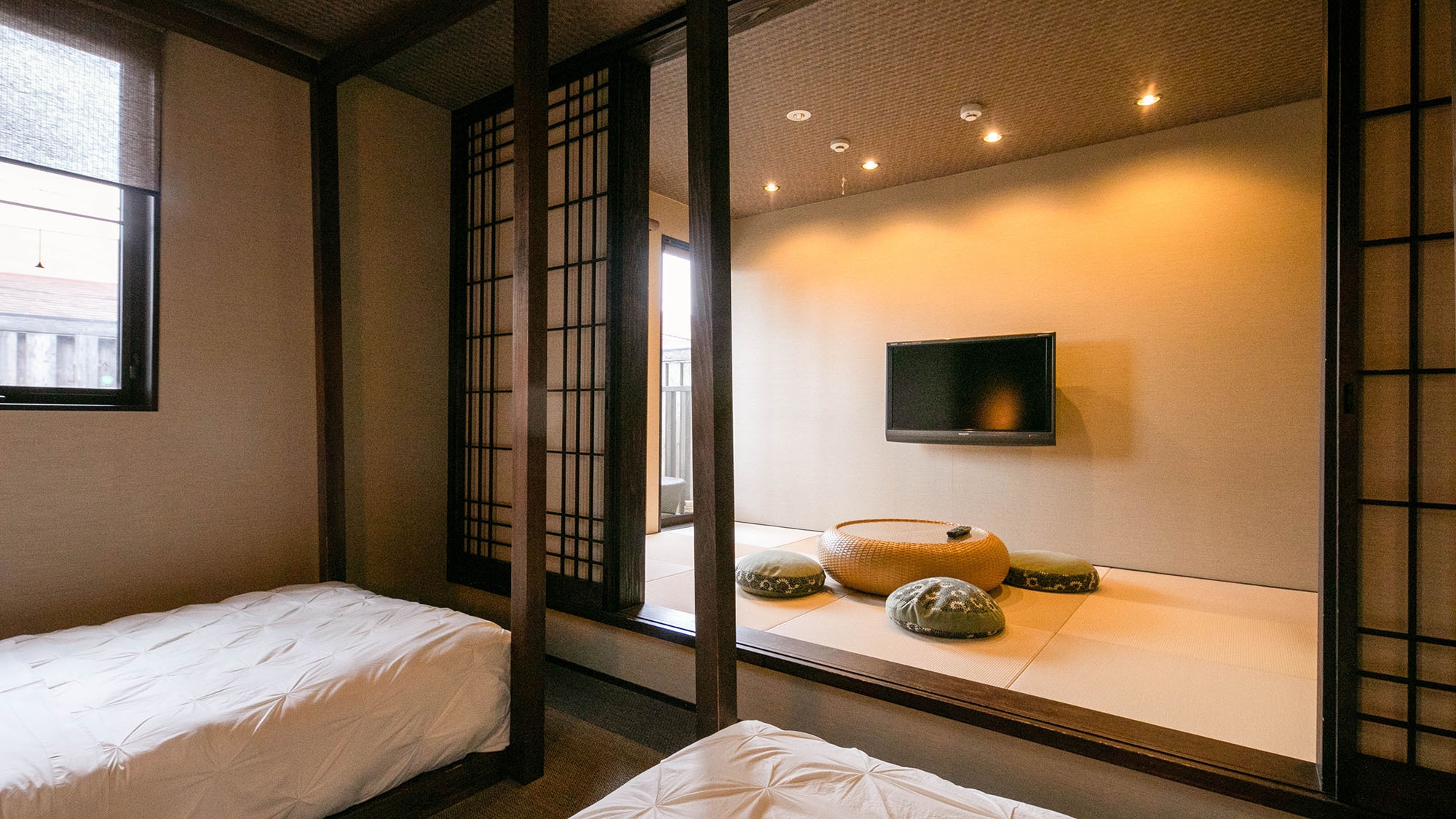 58平米の離れです。メゾネット、露天風呂、内風呂、専用水基、ベッドルーム(ハリウッドツイン1台)、リビングルーム、和室、洗浄機付きトイレ。※テラスにて喫煙可