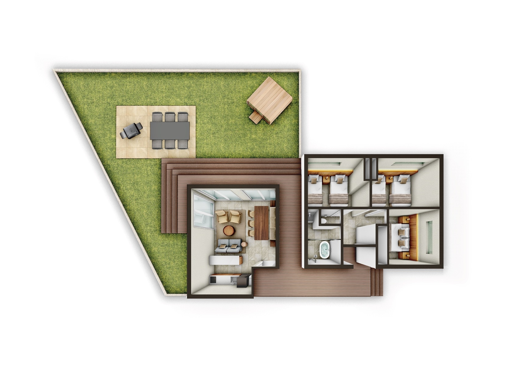 独立したリビング・ダイニングルームと3つのベッドルーム(シングルベッド4台+キングベッド1台)。