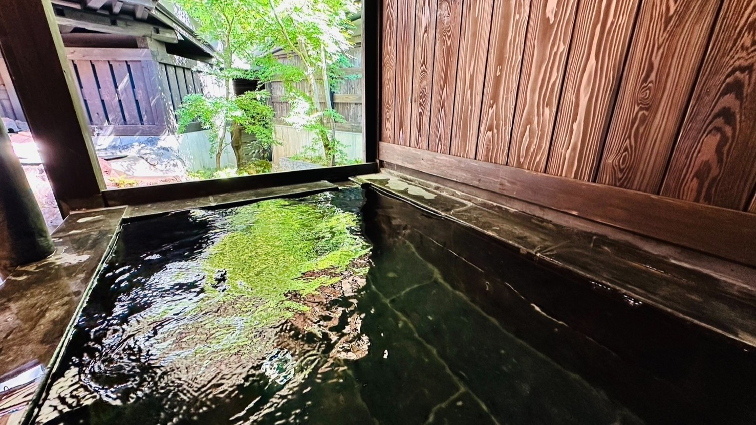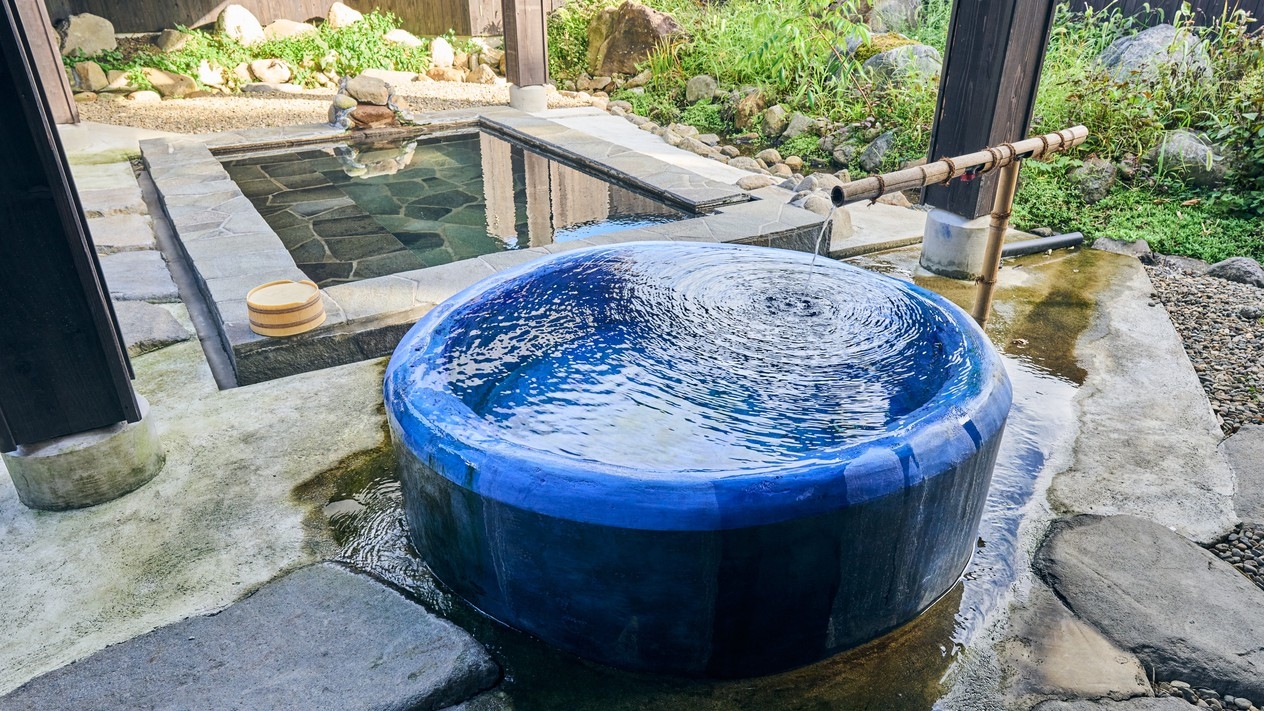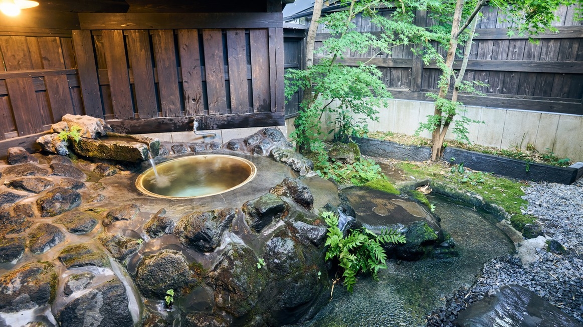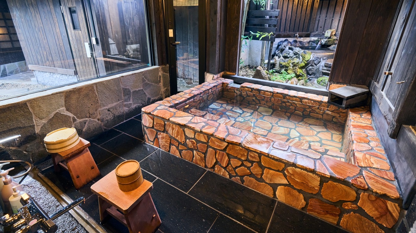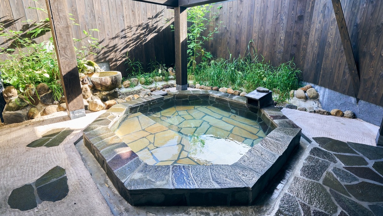 別館・平屋造りの2間続きの和室。お部屋には岩盤浴、切石風呂と五右衛門風呂と2つ御座います。夕食は個室で囲炉裏料理です。