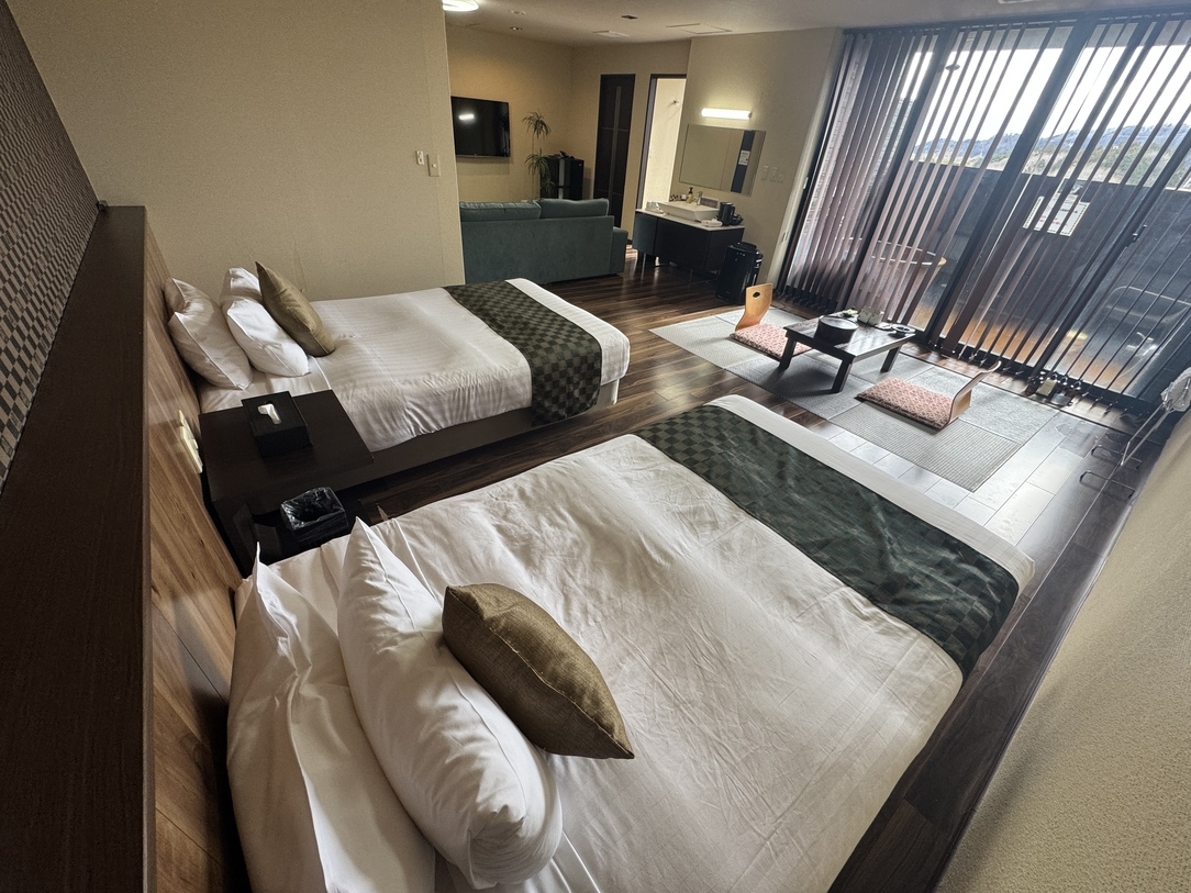 大人3名以上の利用はベット2台と和布団1組になります。大人4名以上はベッドで添い寝となります。客室露天風呂は24時間ご利用可。ベッドサイズ:120×195cm