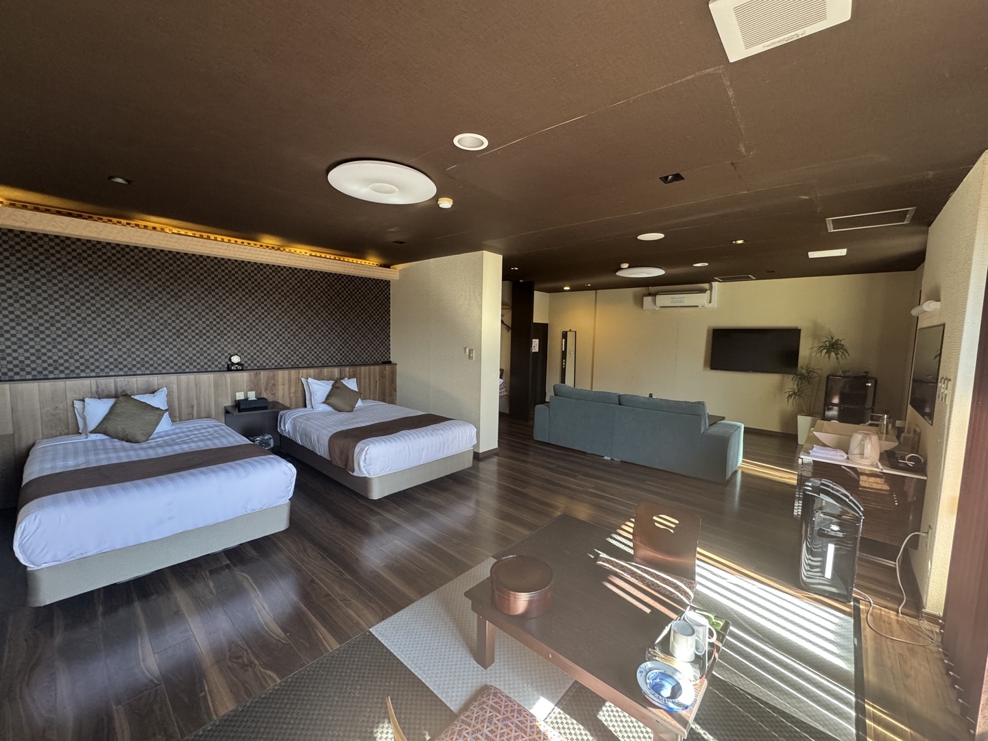 大人3名以上ご利用はベット2台と和布団利用になります。大人4名以上はベッドで添い寝となります。客室露天風呂は24時間ご利用可。