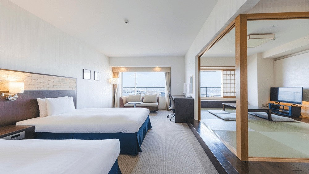 本館最上階(13F)■122cm幅ベッド2台+和室の広々空間■客室内バス・トイレ別■シモンズ製ベッド■小学6年生まで添い寝無料(1ベッドにつき1名様)
