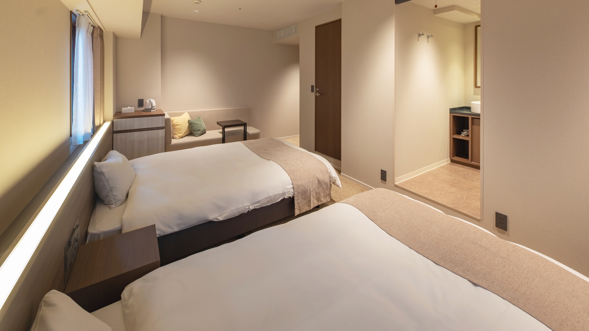 ■部屋によって仕様が異なります■ベッドサイズ幅120cm以上×長さ195cm(2台)■洗浄機付きトイレ■枕元にコンセントあり■インターネット接続無料