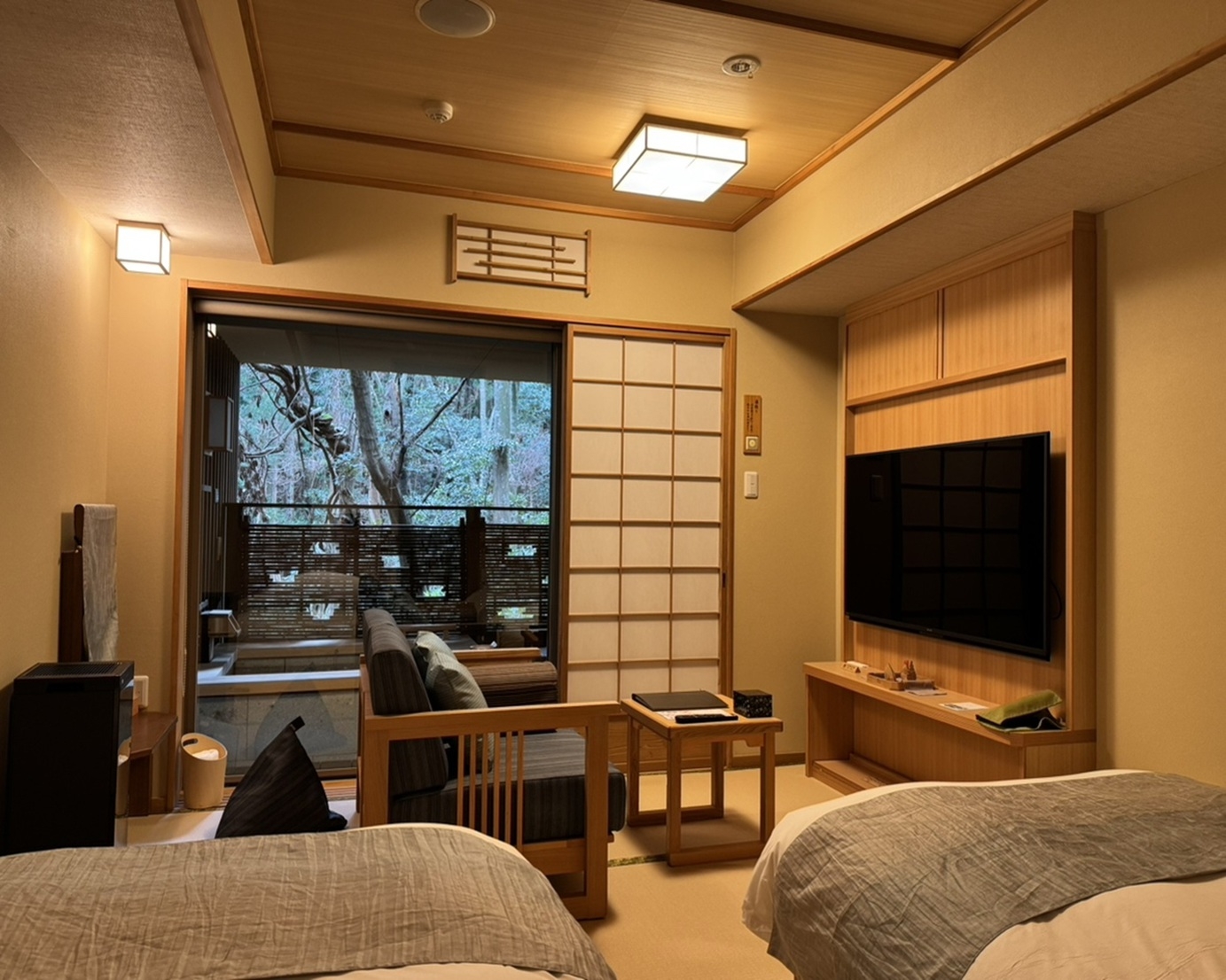 ツインのベッドルームと広い和室が繋がった、寛ぐスペースが最も広いお部屋です。足湯付きです。1F専用ドリンクスペースを無料でご利用可