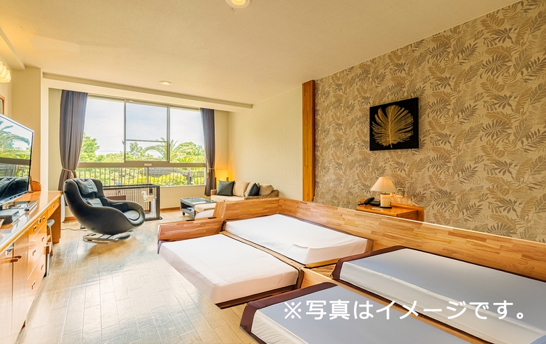 アジアンテイストで入口からベッドまで段差がないフラットフロア/クッションフロア/ローベッドタイプ/マッサージチェア/愛犬用ケージ&ステップ/