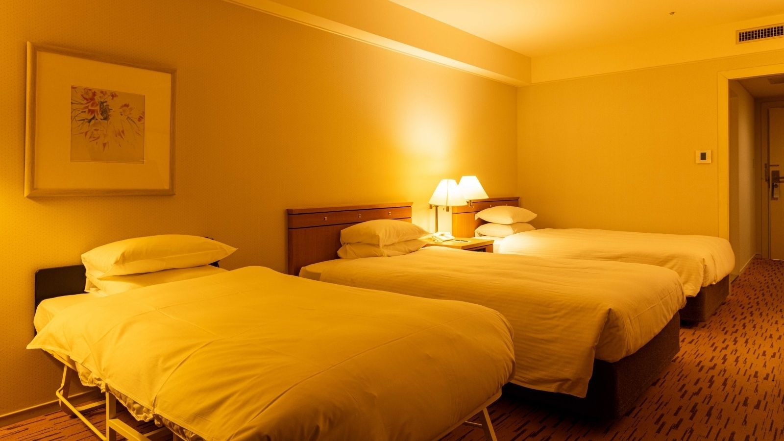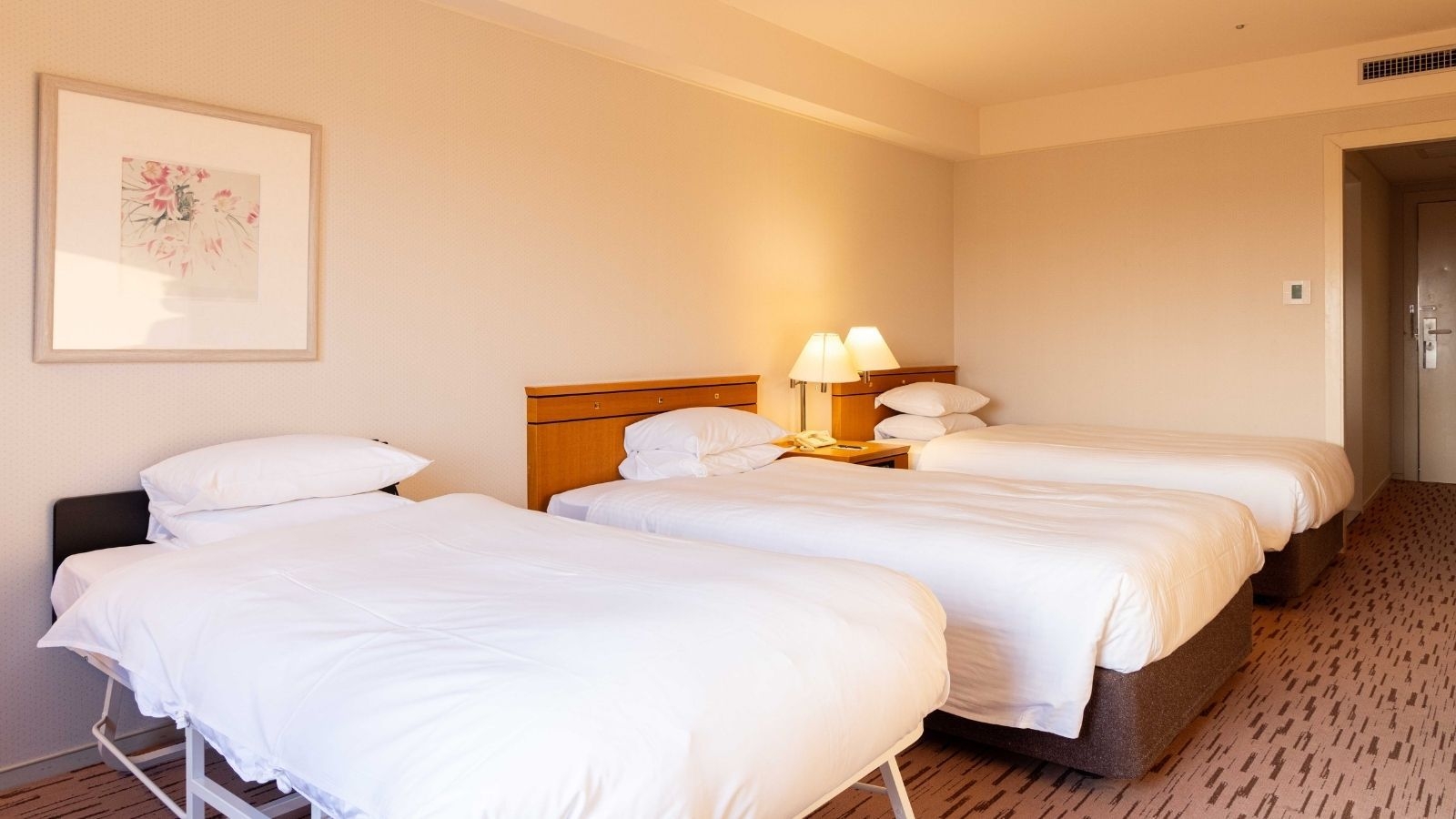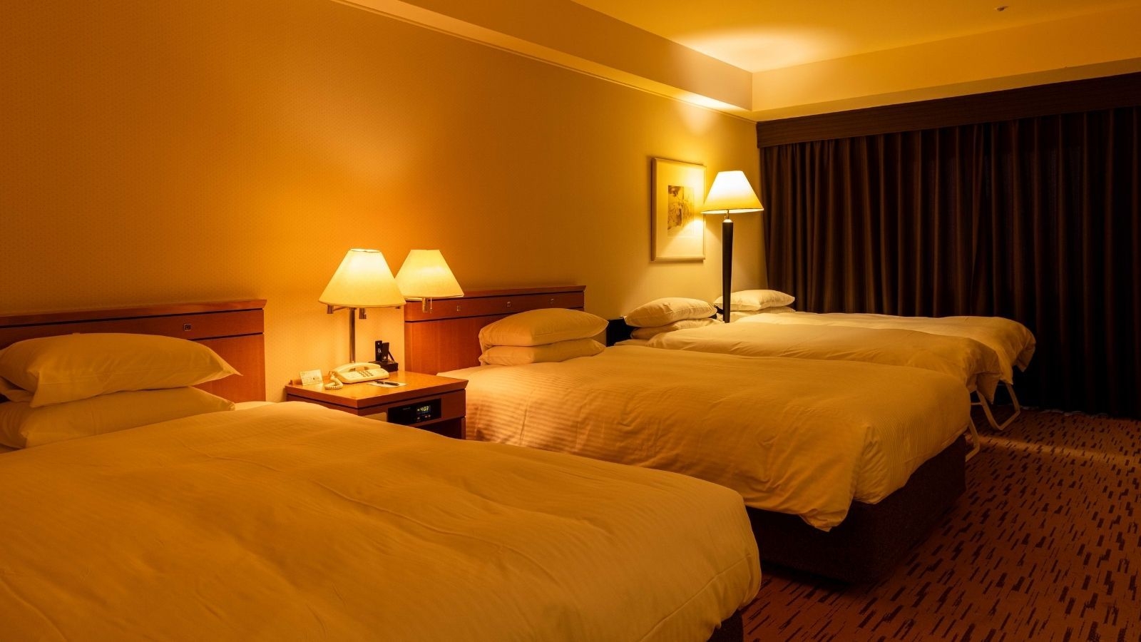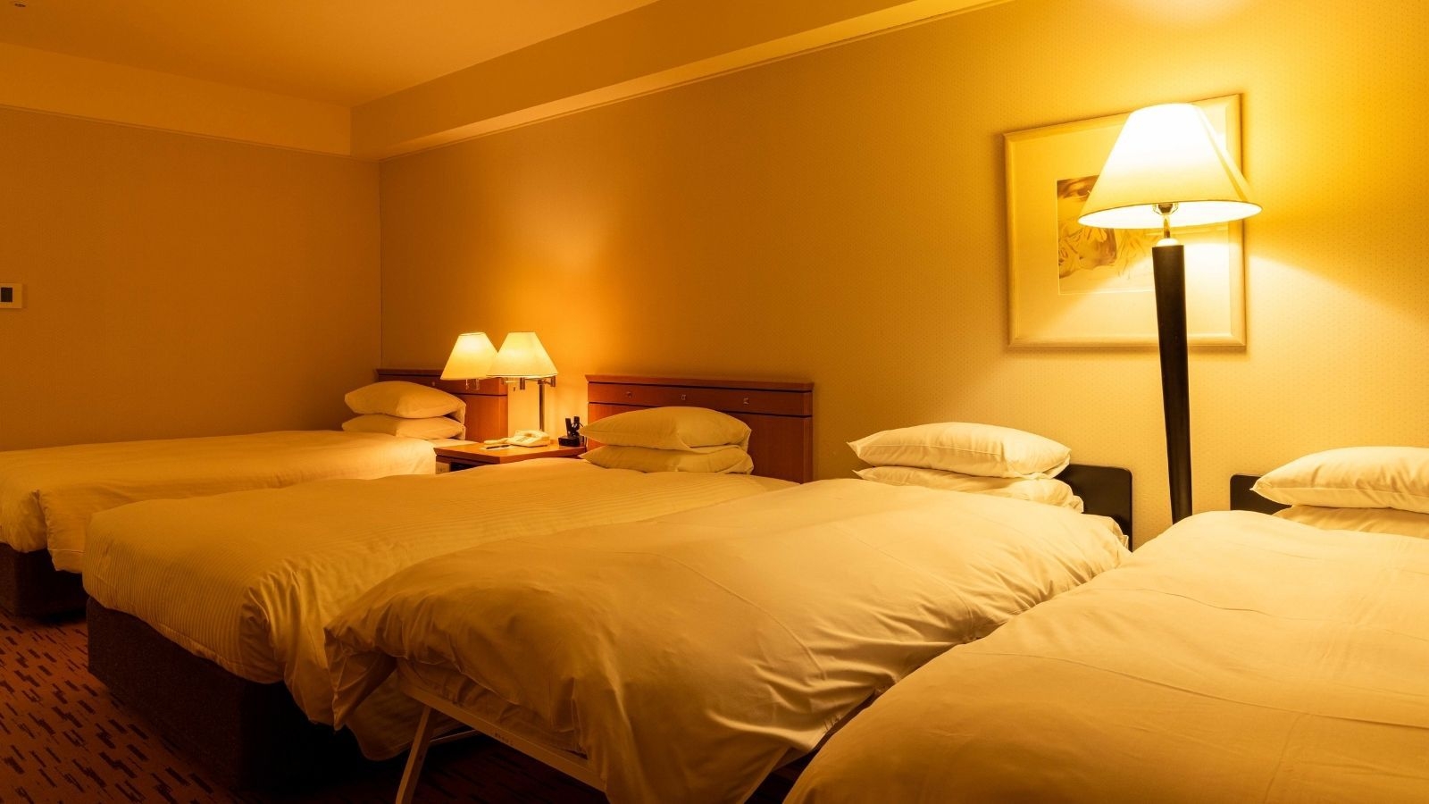 ツインベッド(120センチ幅×2台)とエキストラベッド2台(90センチ幅×2台)