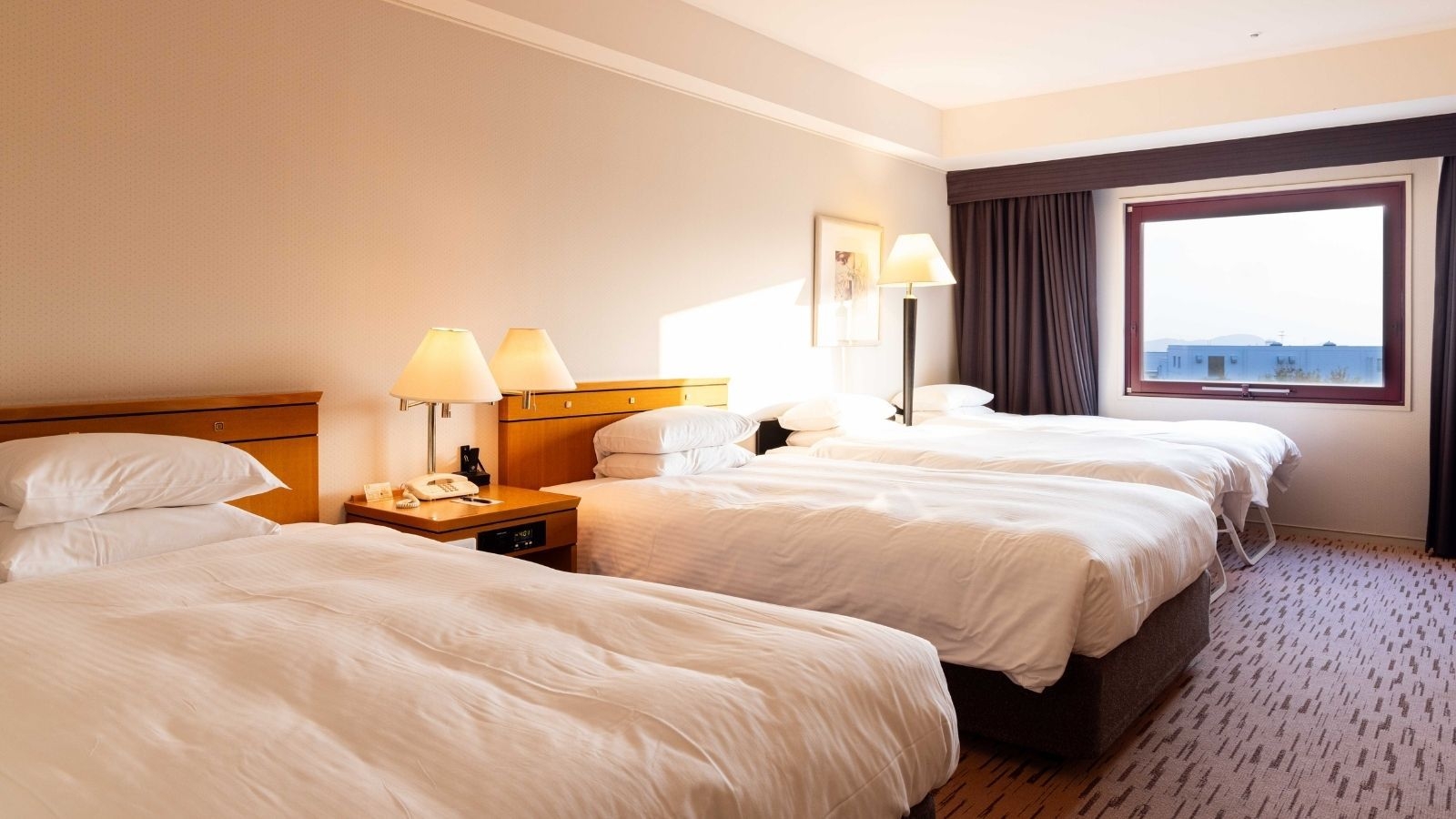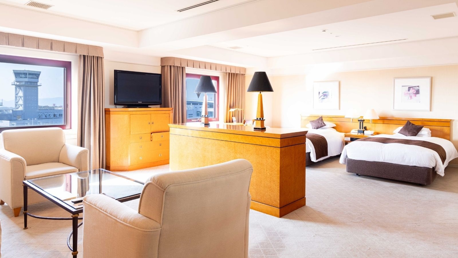 広島空港の滑走路を望むお部屋です。33平米・禁煙・120cmセミダブルベッド2台エキストラ1台・インターネット無料・プラズマクラスター空気清浄機加湿器完備