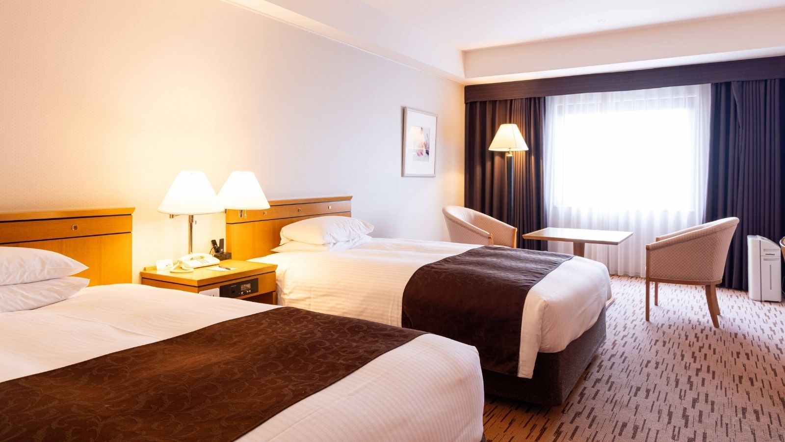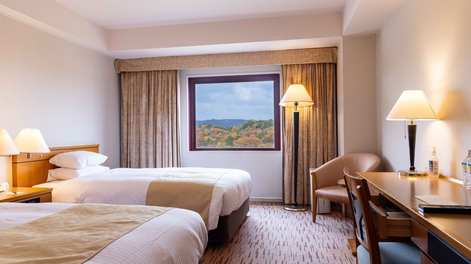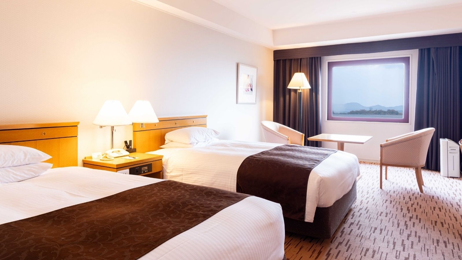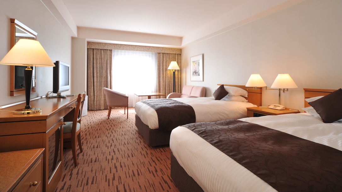 日本庭園「三景園」を望むスタンダードツインルーム。25平米・禁煙・120cmセミダブルベッド2台・インターネット無料・プラズマクラスター空気清浄機加湿器完備