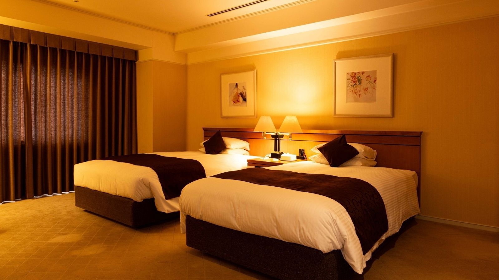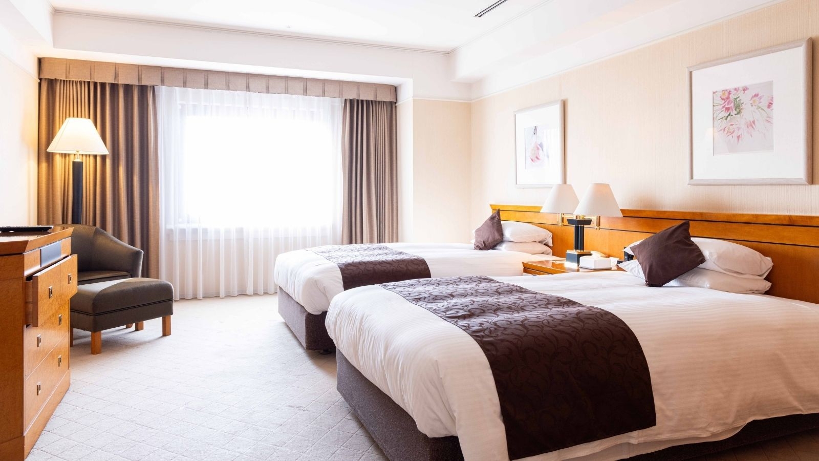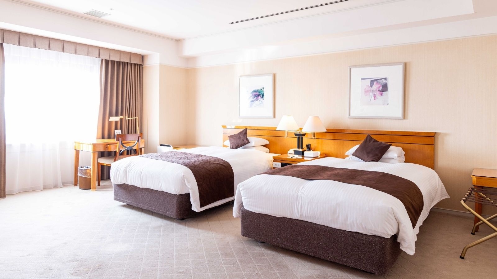 日本庭園「三景園」を望むスタンダードツインルーム。25平米・禁煙・120cmセミダブルベッド2台・インターネット無料・プラズマクラスター空気清浄機加湿器完備