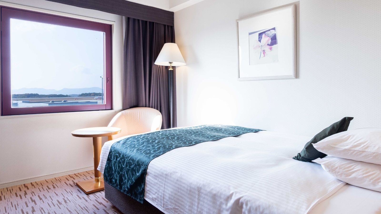 広島空港の滑走路を望むお部屋です。18平米・禁煙・140cmダブルベッド・インターネット無料・プラズマクラスター空気清浄機加湿器完備