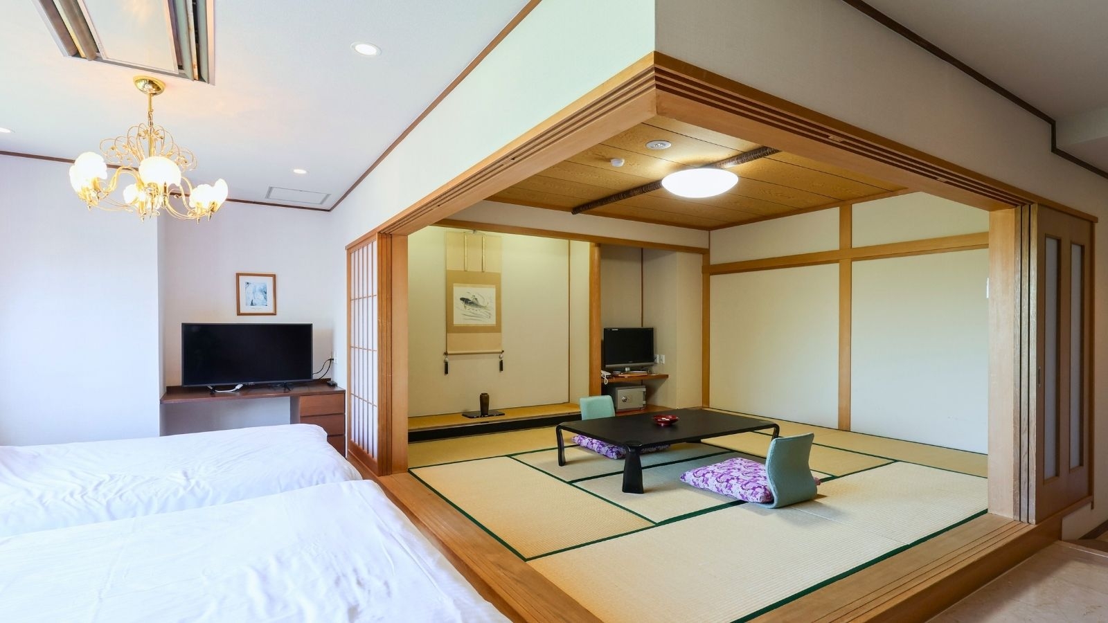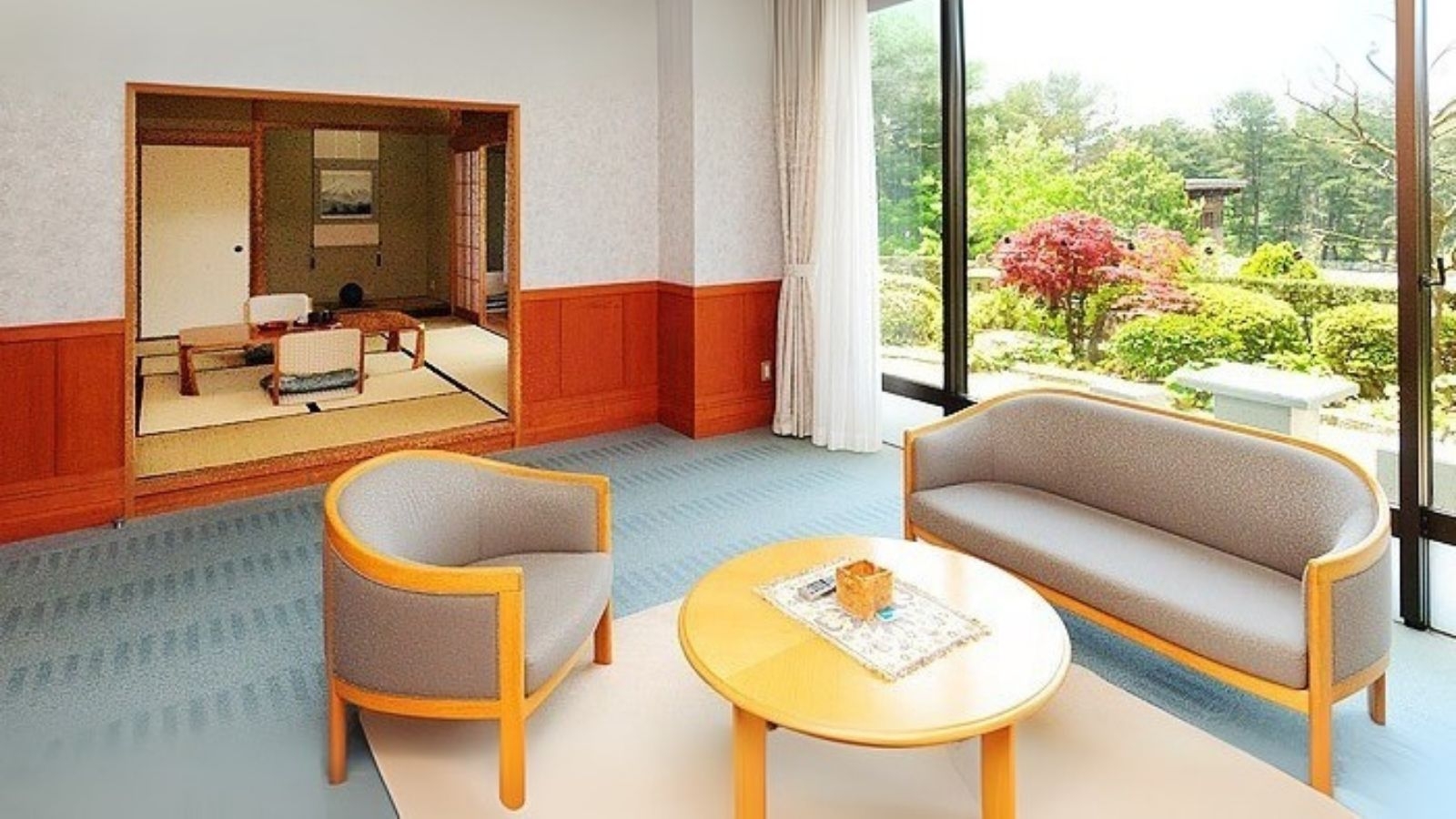 特別室Aタイプ(最上級客室) / 10畳和室+リビング+寝室(定員:7名)/ バリアフリー設計 / プライベートガーデン付
