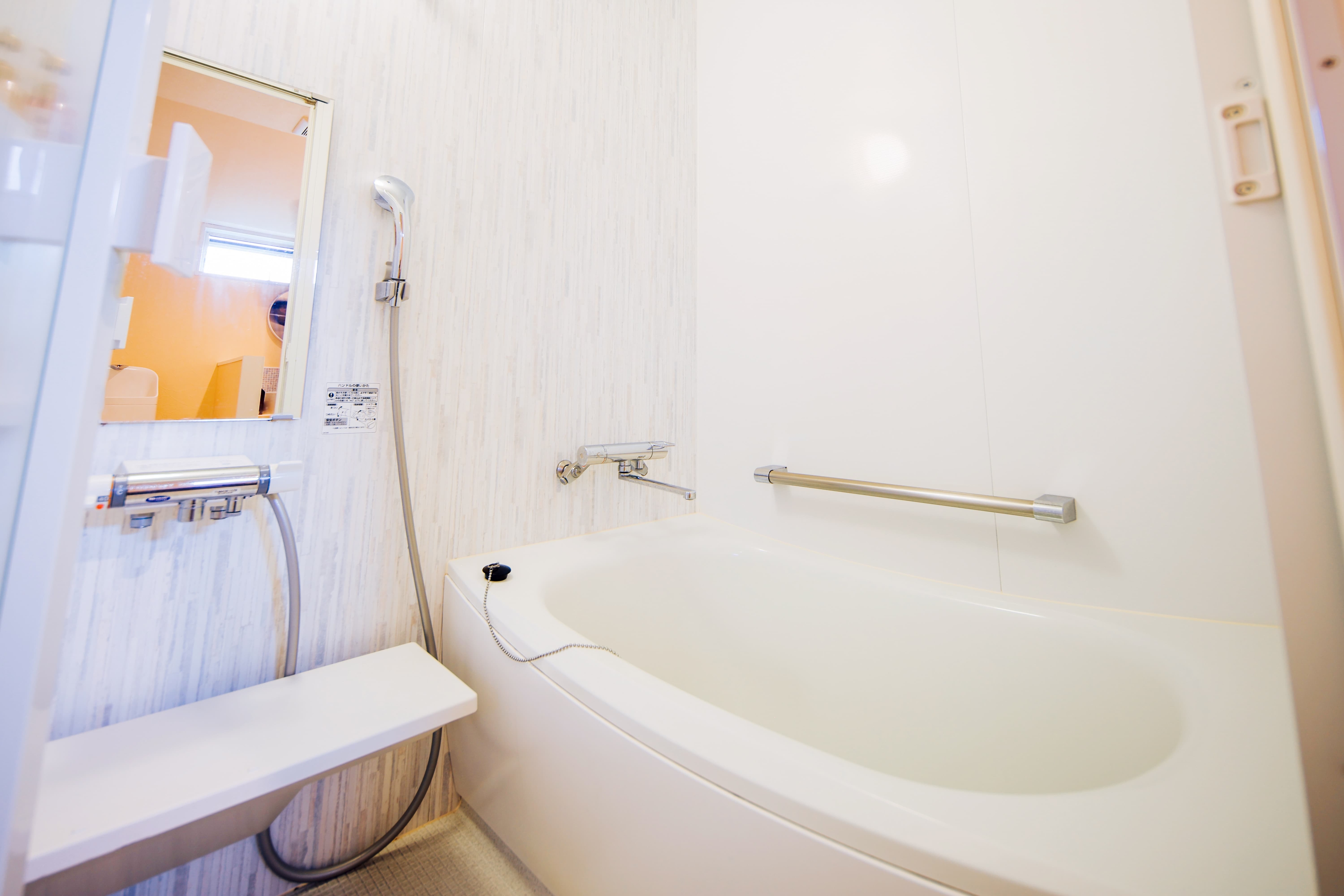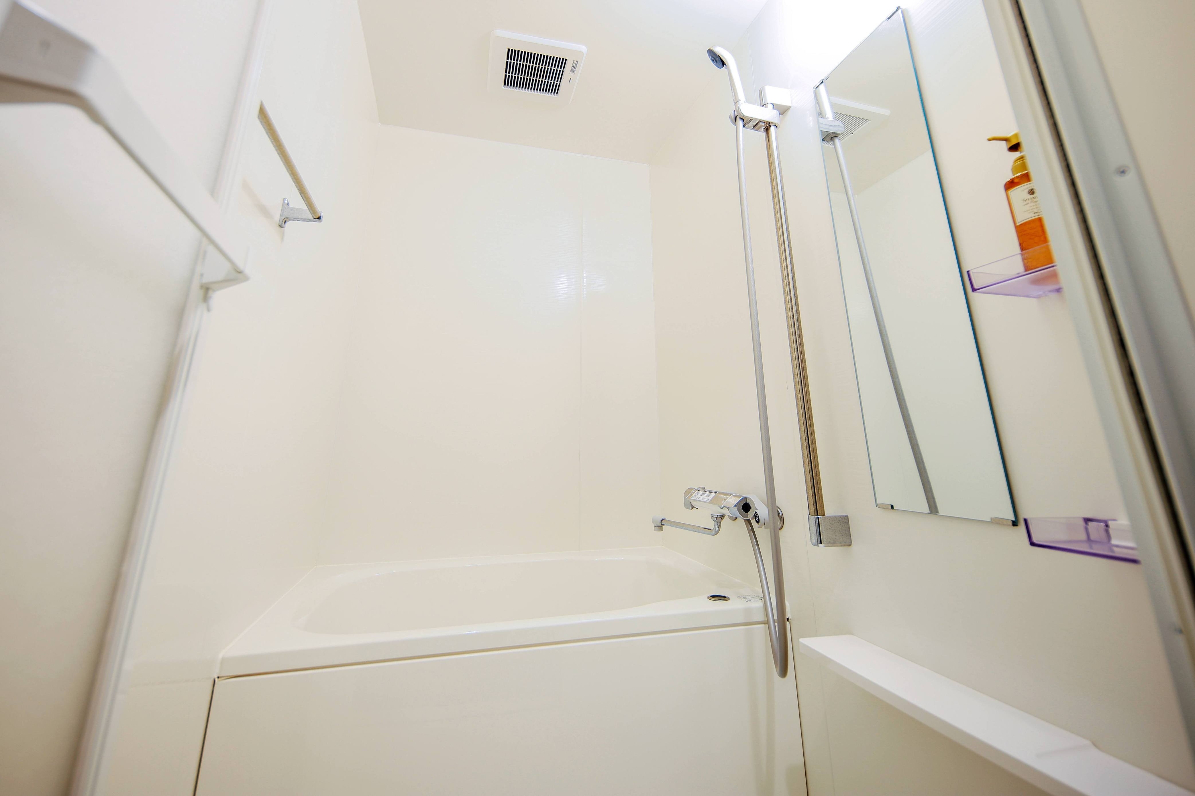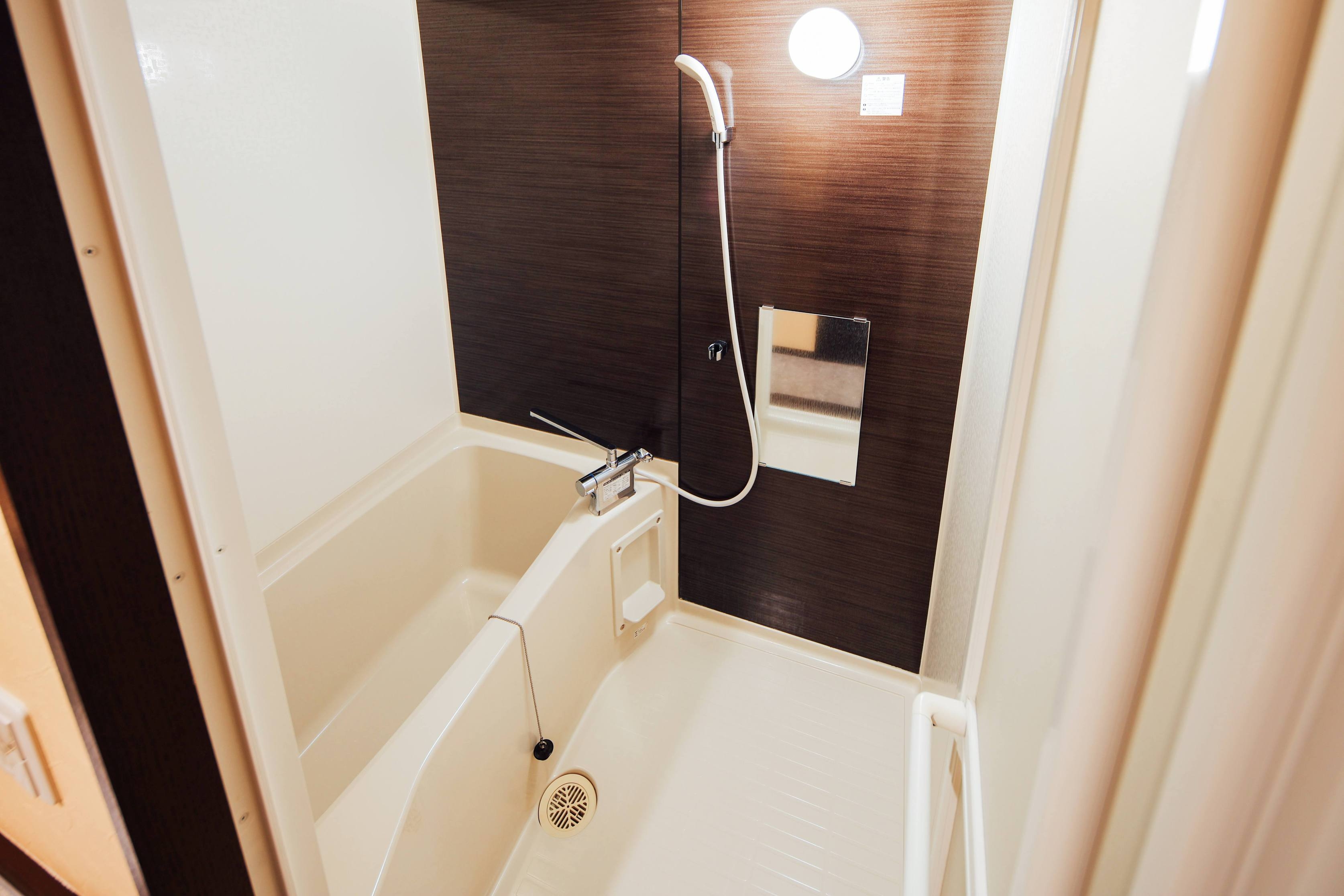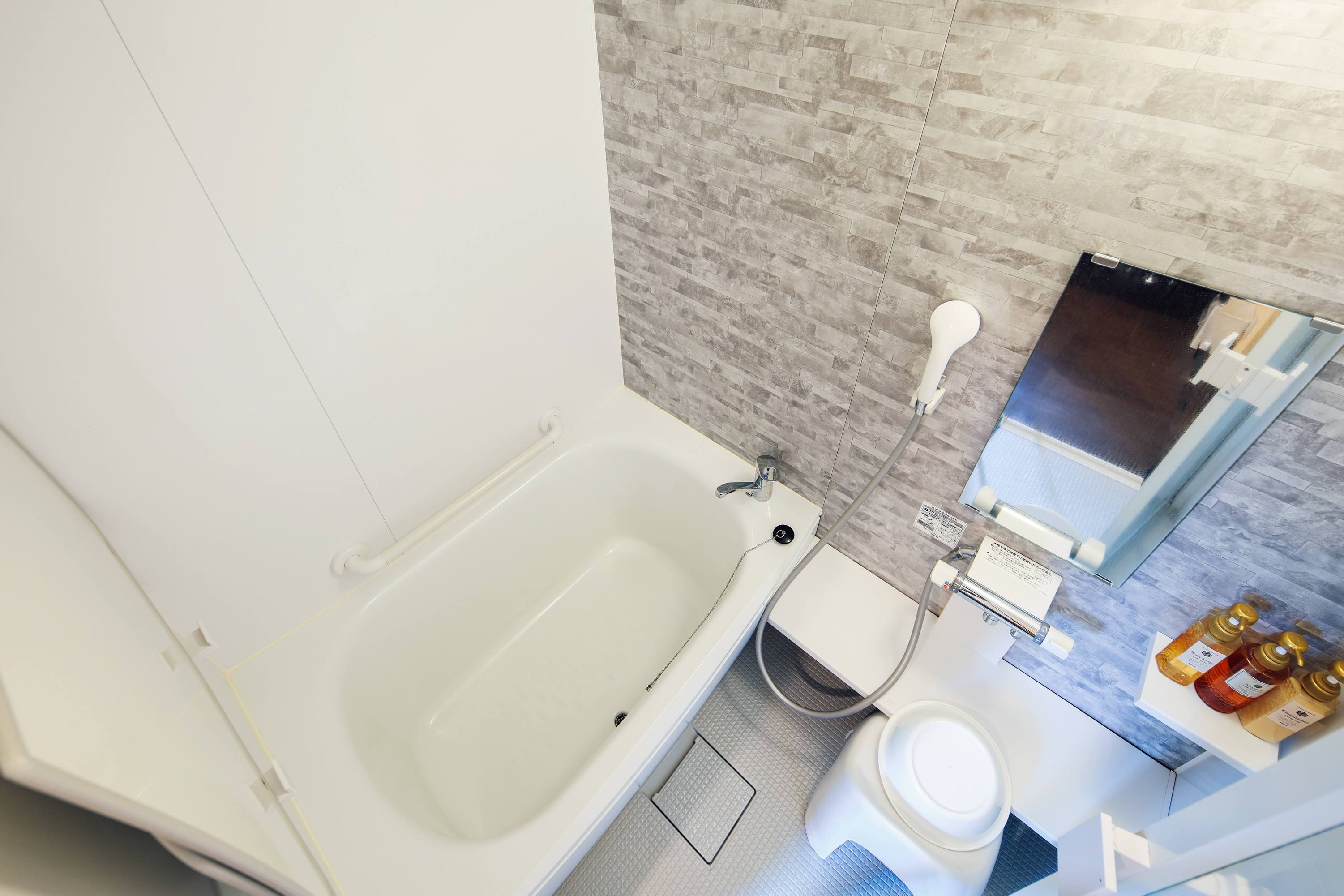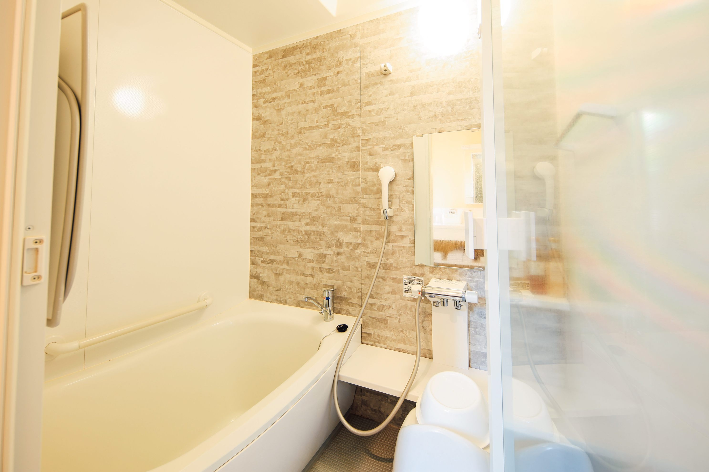 2016年2月に内装工事。4名様ご利用のお部屋です。2台のセミダブルベッドを挟んでリビングスペースがあります。お風呂は、浴槽と洗い場が別になっているタイプです。