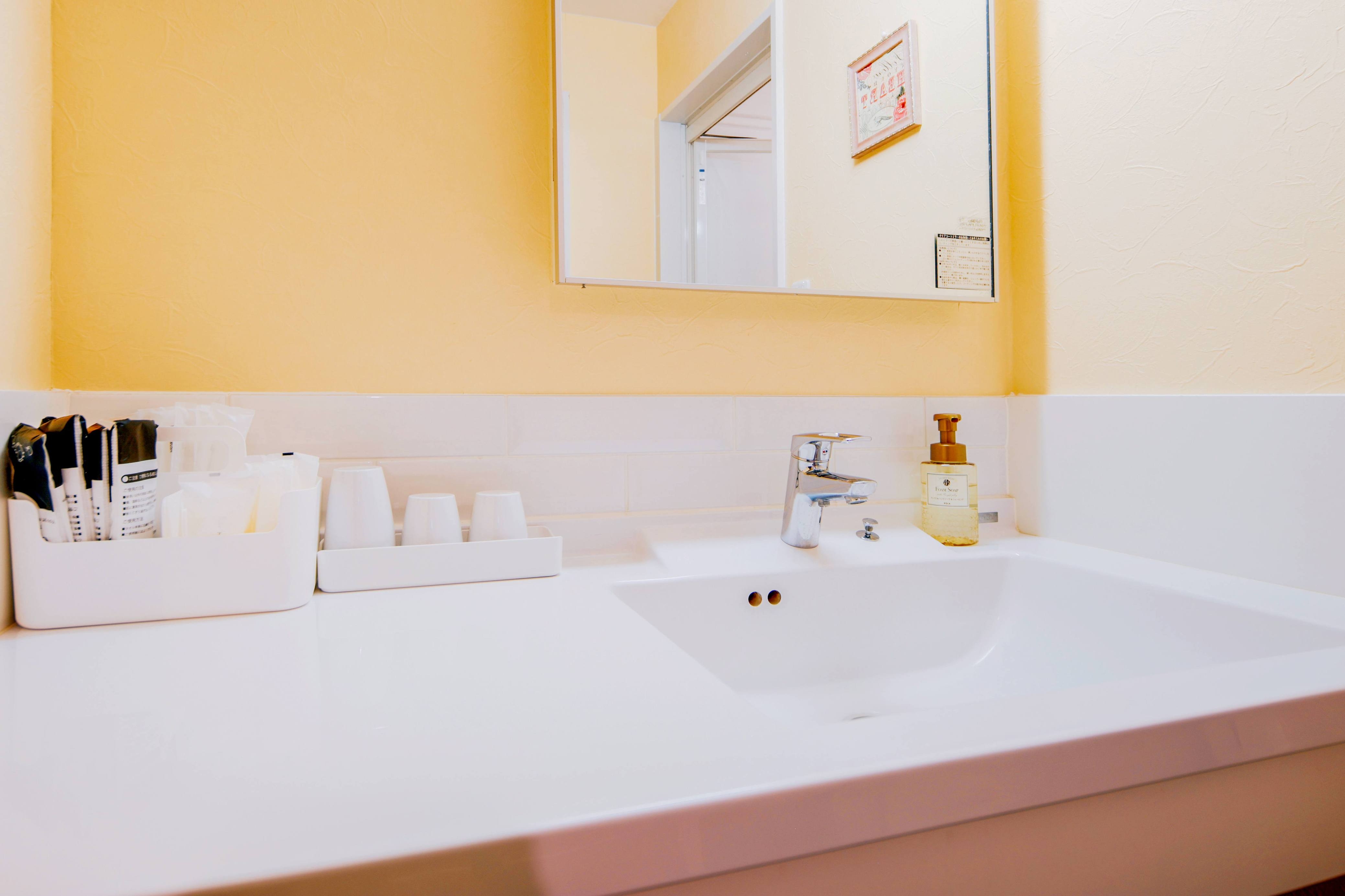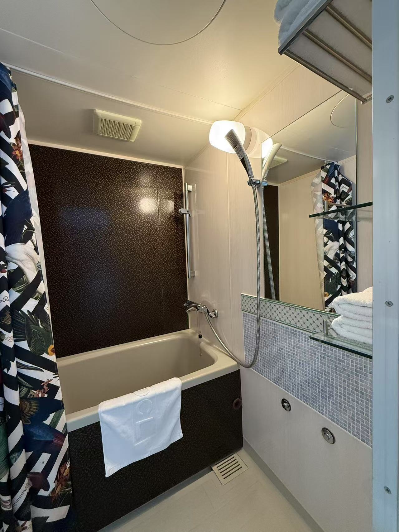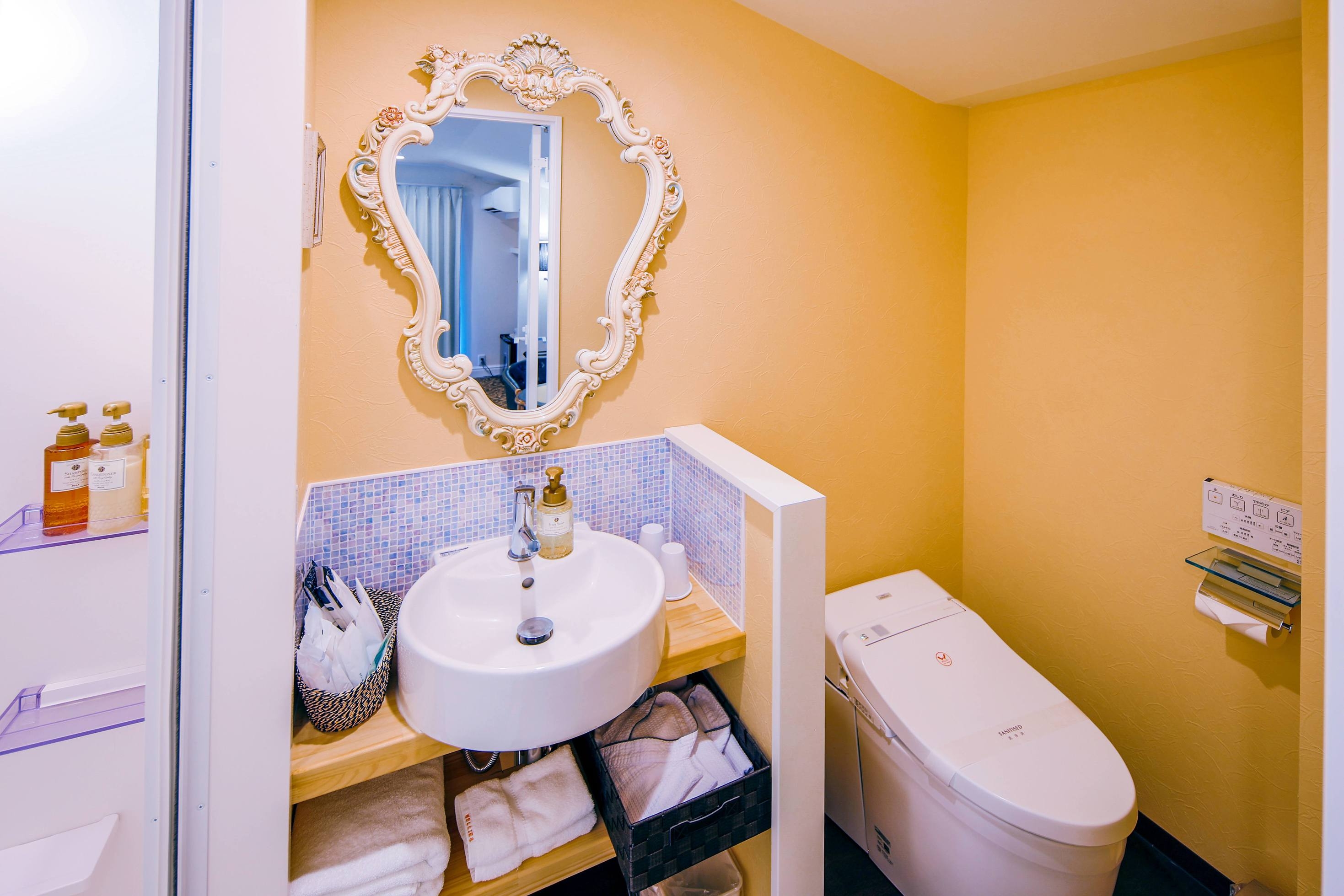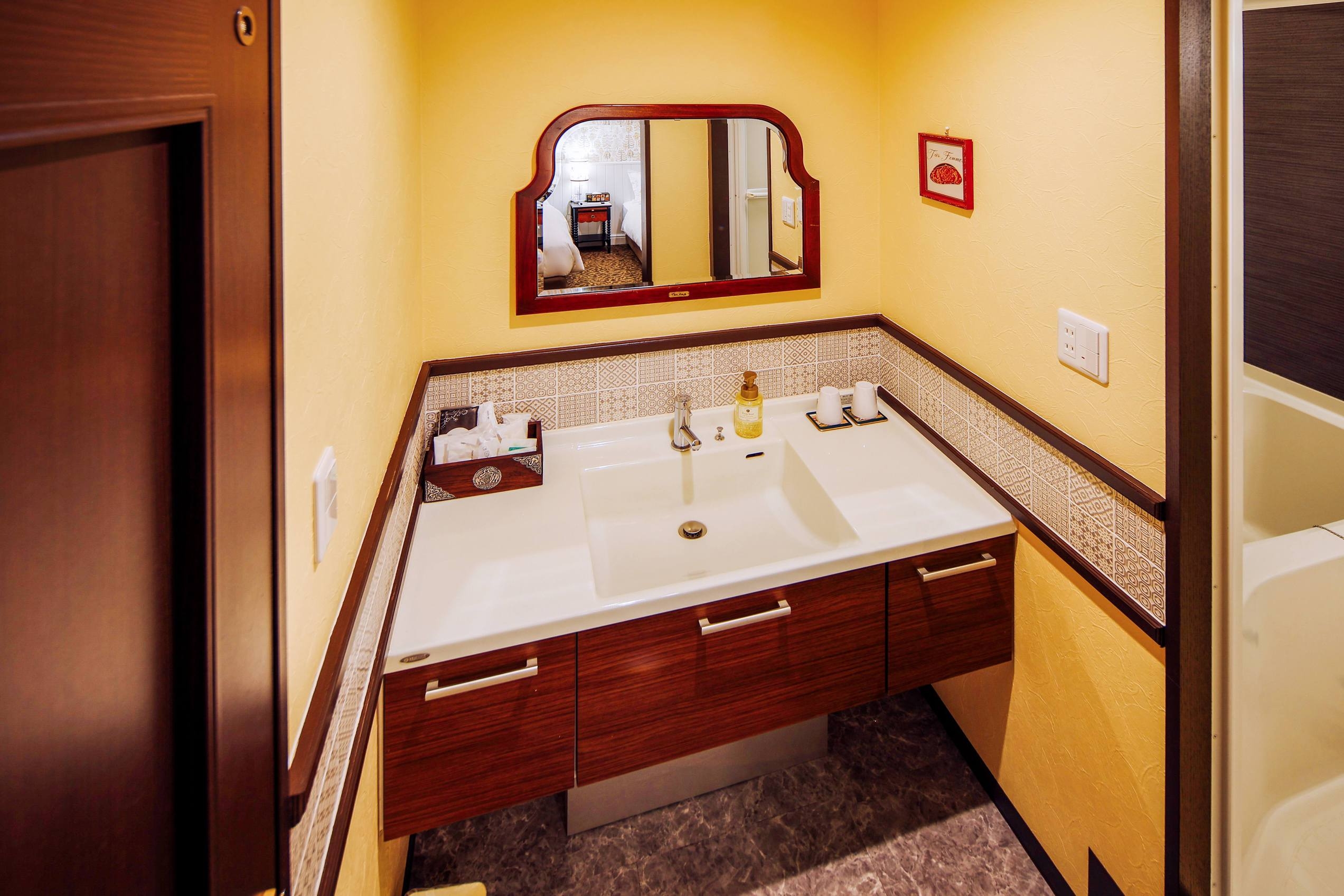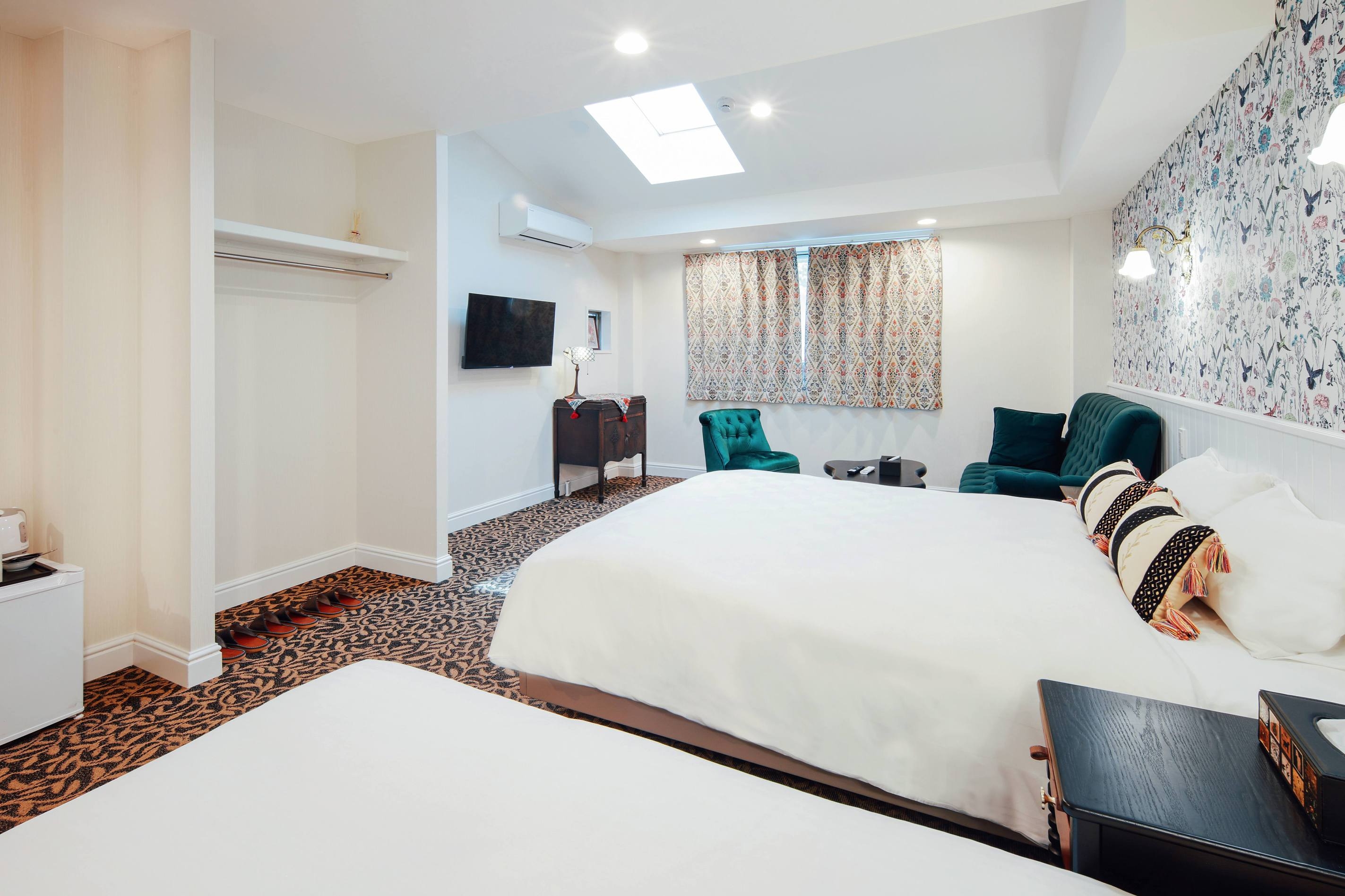 2016年2月に内装工事。4名様ご利用のお部屋です。2台のセミダブルベッドを挟んでリビングスペースがあります。お風呂は、浴槽と洗い場が別になっているタイプです。