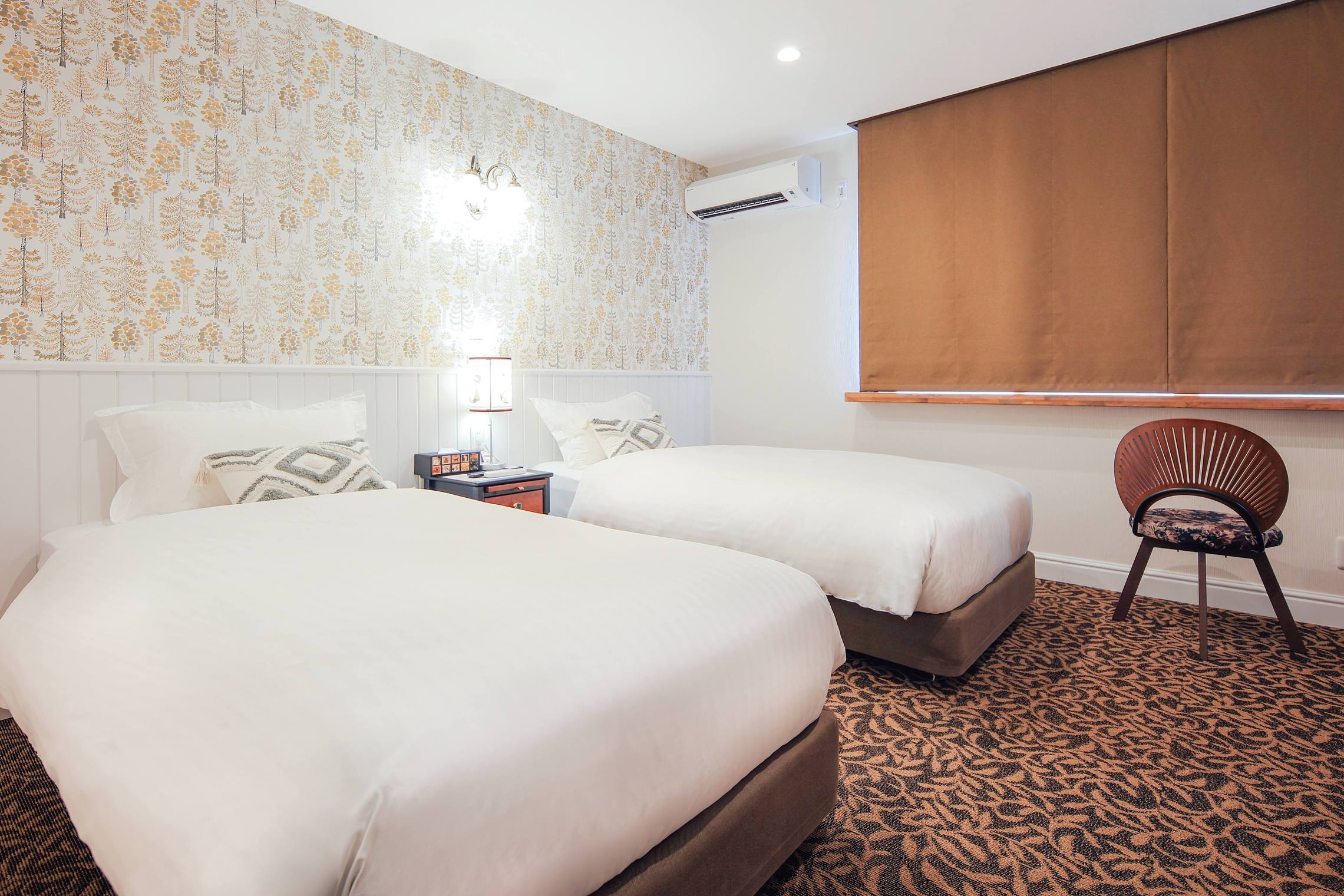 2019年3月 リニューアル致しました、ツイン・ベッドのお部屋です!!窓から鳥たちがさえずる木々をご覧いただけます 。お風呂とトイレは別々です。