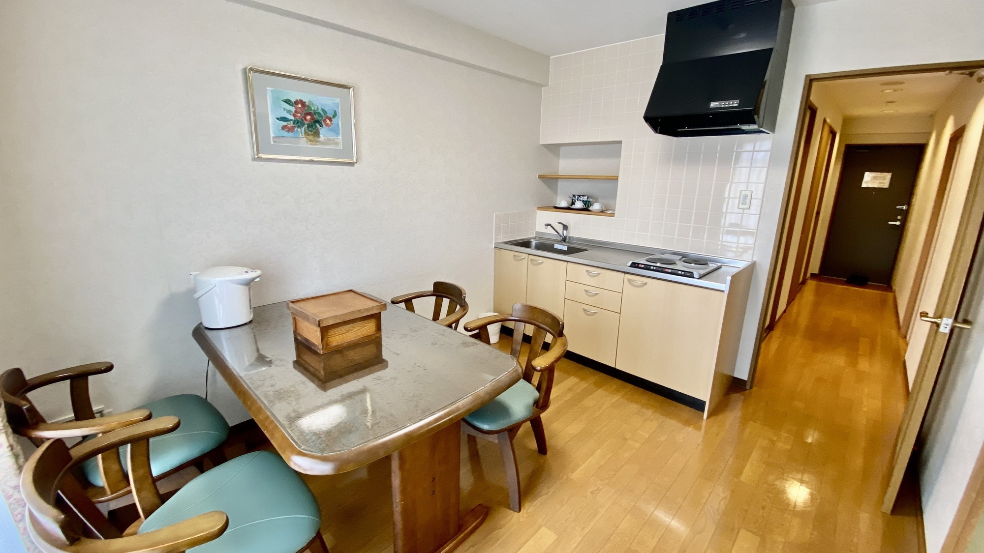 長期滞在にもおススメのミニキッチン付きのお部屋にツインベッドをご用意いたしました。バリアフリー対応ですので、お子様から高齢の方まで、ご家族揃って御宿泊頂けます。