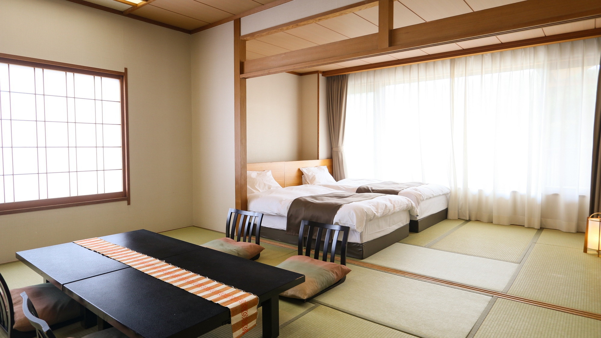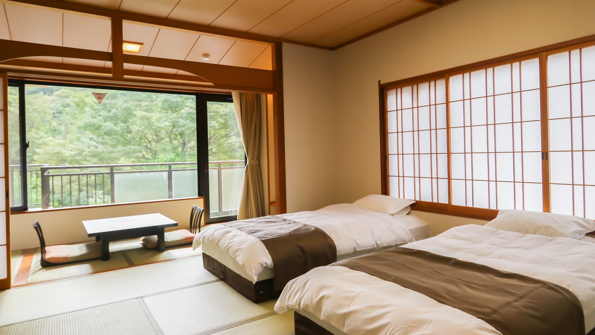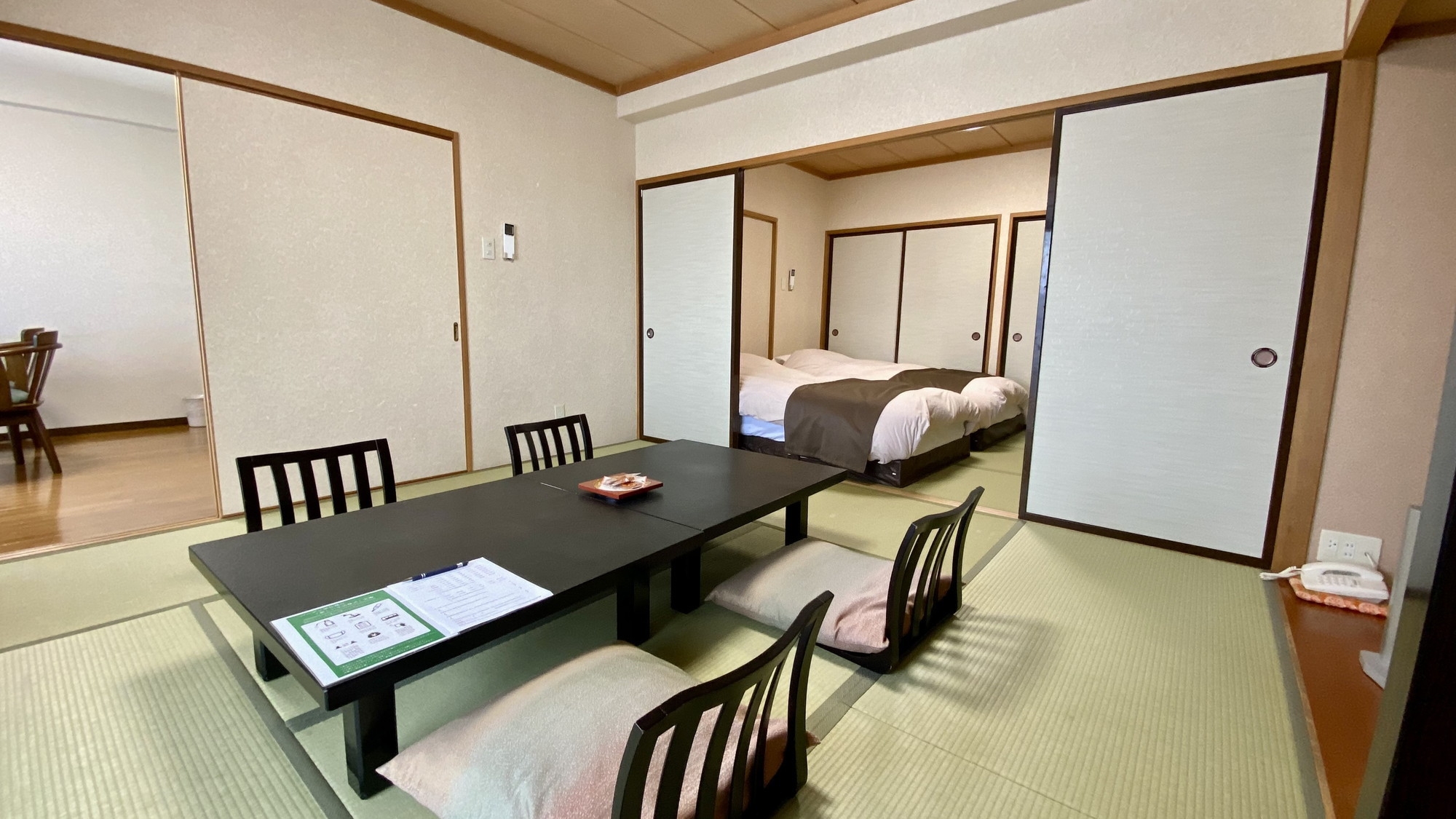 大浴場からも程近く、落ち着いた雰囲気漂う純和風和室にツインベッドをご用意いたしました。 二間続きのお部屋ですので、グループやご家族でのご利用にぴったりです。