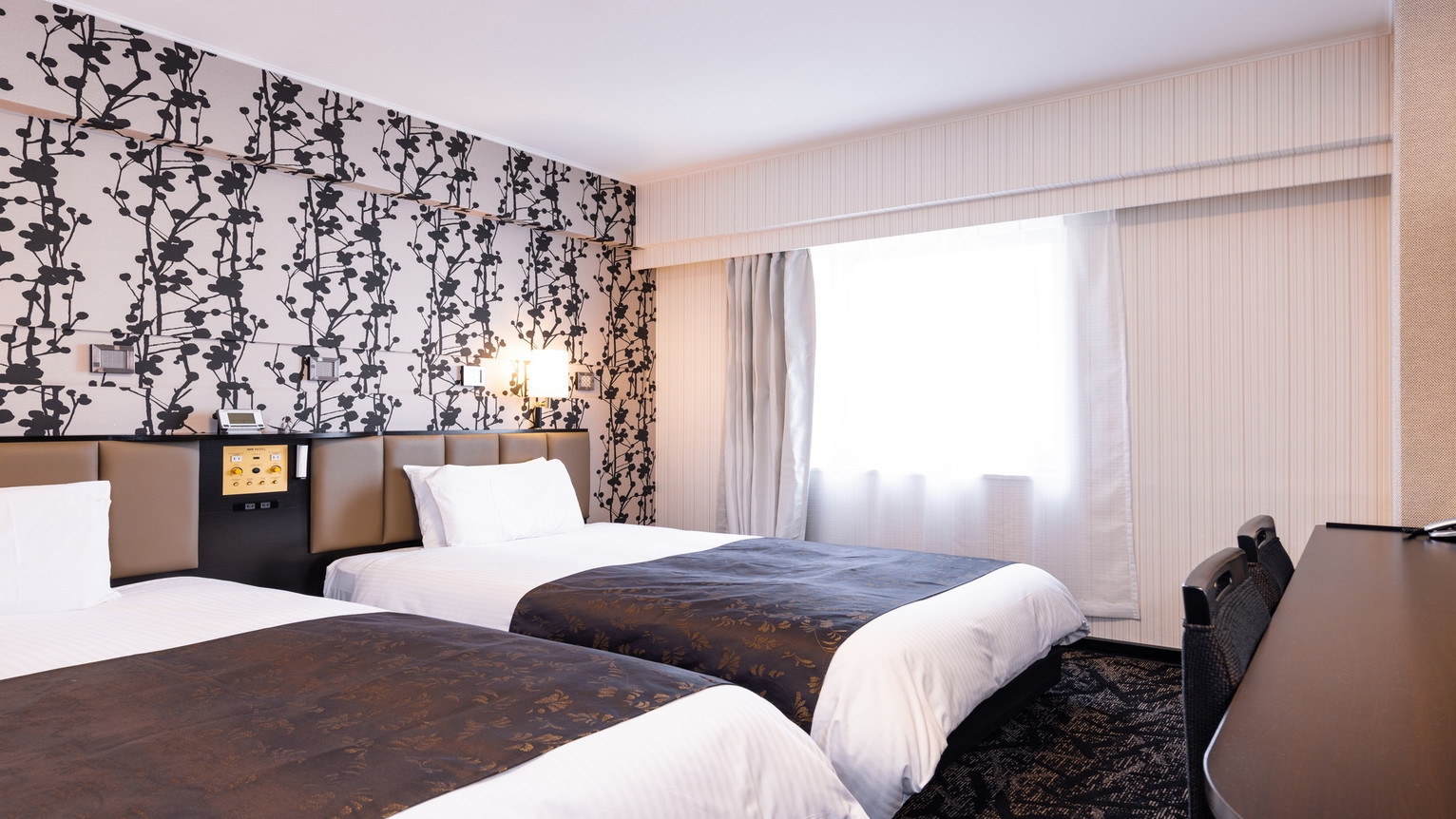 ■広さ14〜17平米 / ベッド幅120cm×2台 □無料ネット接続(Wi-Fi / 有線LAN) □40型液晶テレビ □高級羽毛布団 □温水洗浄便座