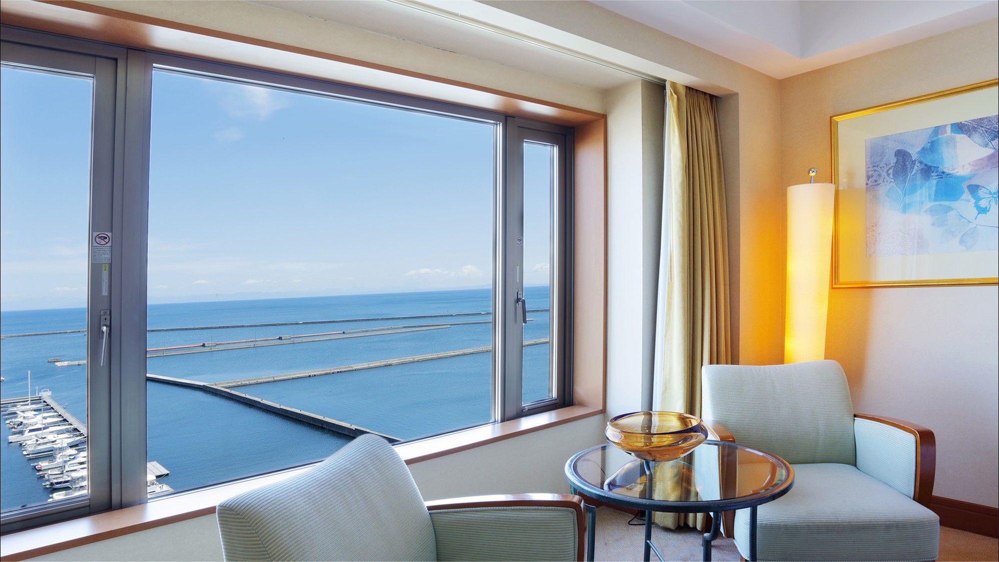 眼下に小樽港マリーナ、その向こうには息をのむほどに美しい石狩湾の大パノラマをお楽しみ頂けるオーシャンビュールーム。