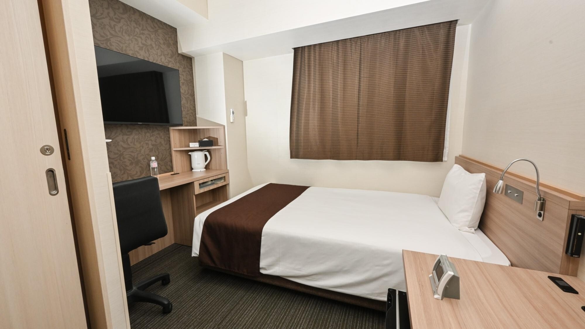 バス・トイレ・洗面台独立の快適空間♪15平米のお部屋にベッド幅140センチのダブルベッド使用。個別空調・加湿空気清浄機完備・Wi-Fi接続無料。