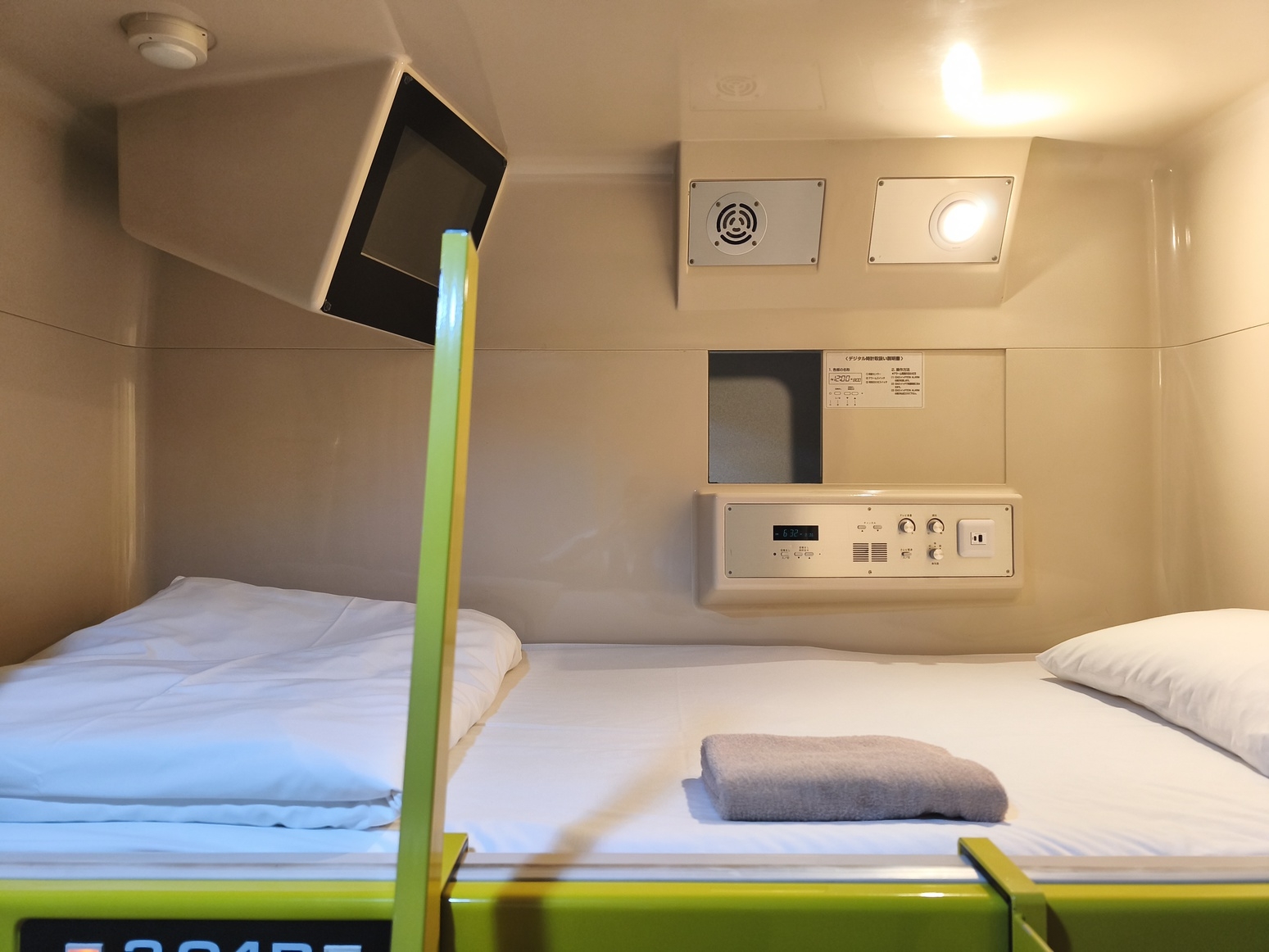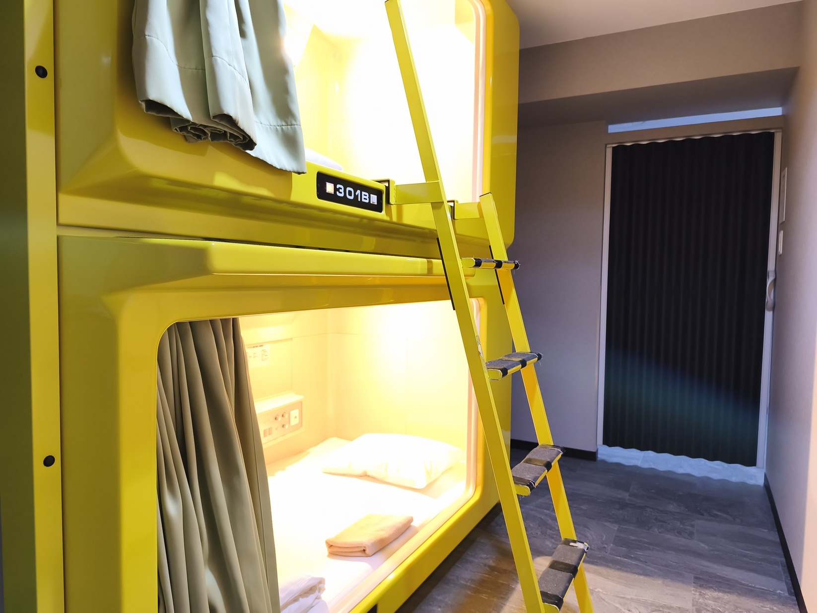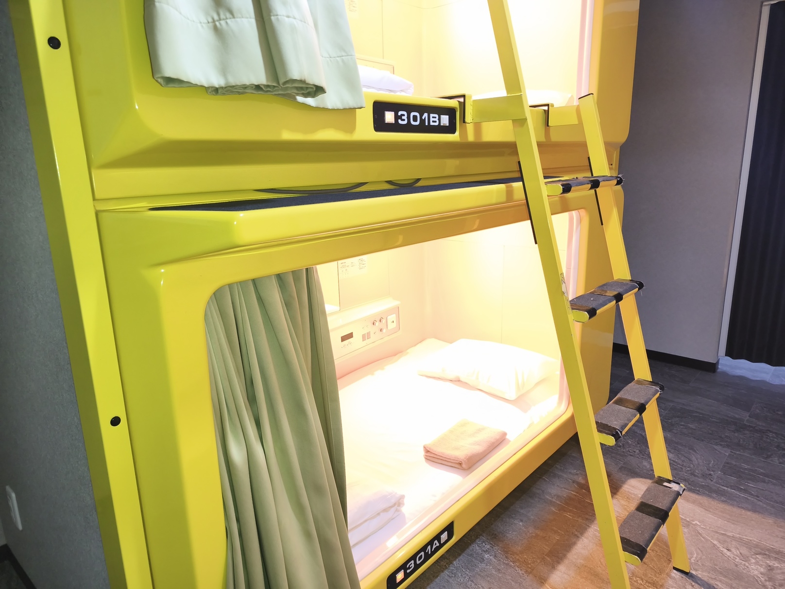 2025年よりリノベーション。半個室タイプで自分だけの空間が確保できる隣のカプセルと上下2段の交互型。ドアはアコーデオン式施錠不可。トイレ・バス共同。全館禁煙