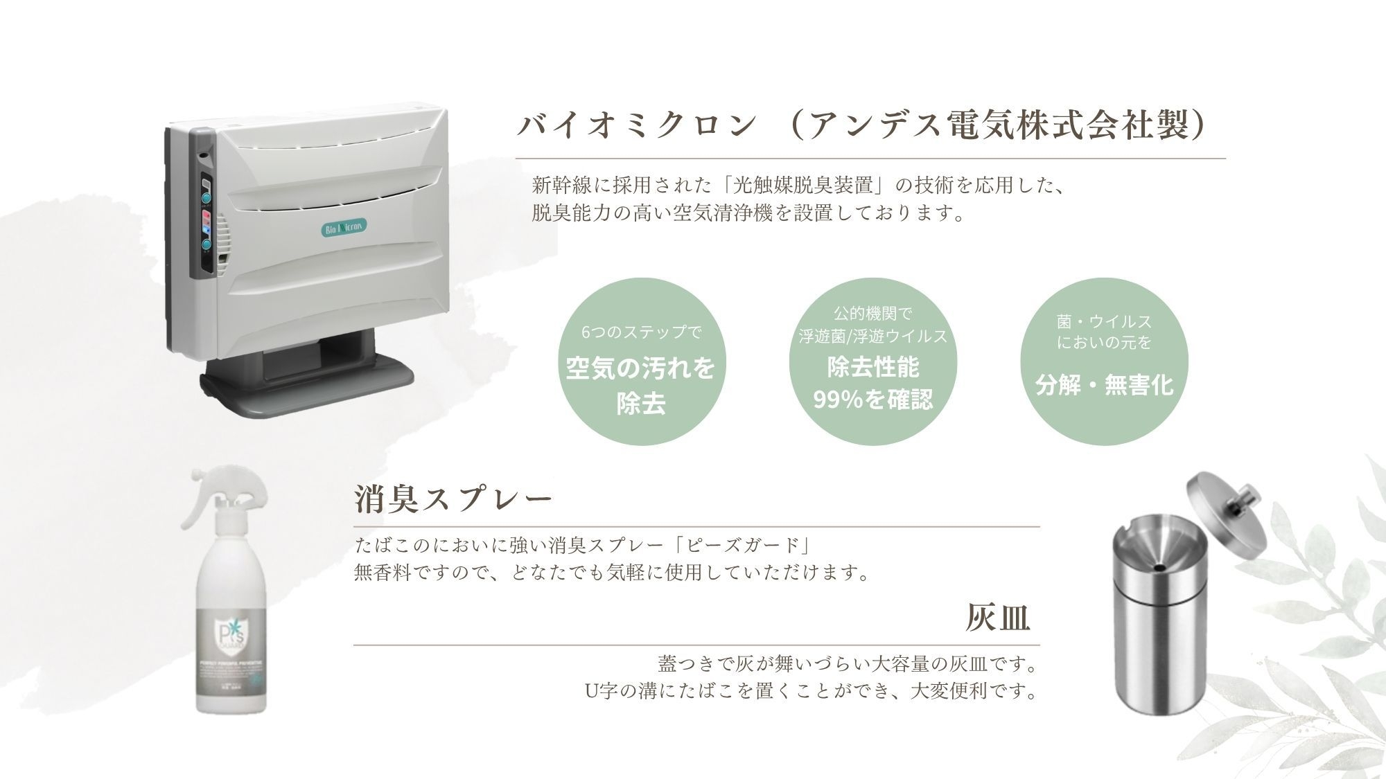 煙草のにおい除去に特化した高性能な脱臭機と消臭スプレーを完備。