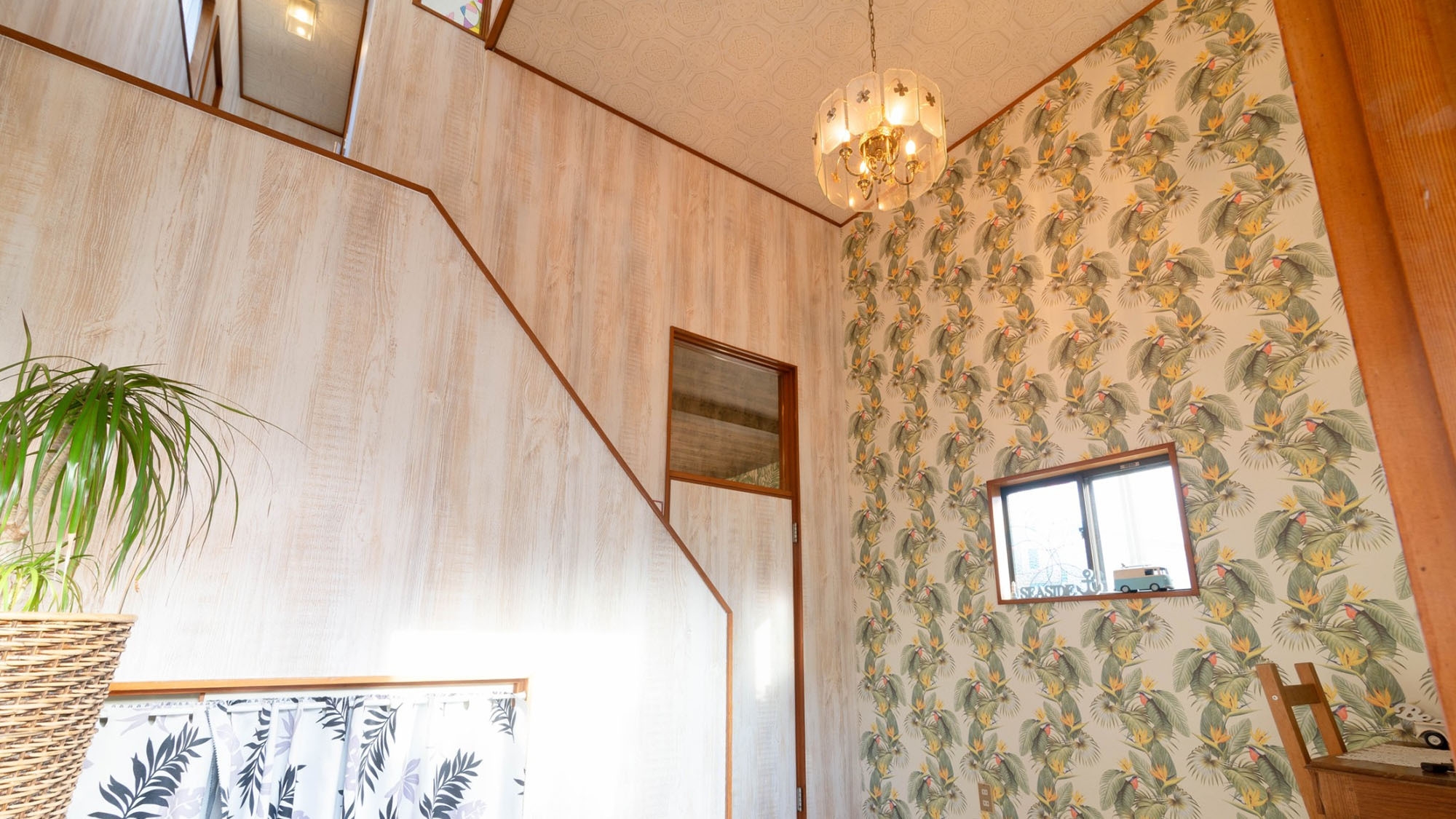 スカイブルーの鮮やかな壁がひと際目をひく一軒家。2LDKの間取りで5名様まで泊まれます。ファミリーやグループでのお泊りに最適。庭で炭火BBQが可能です