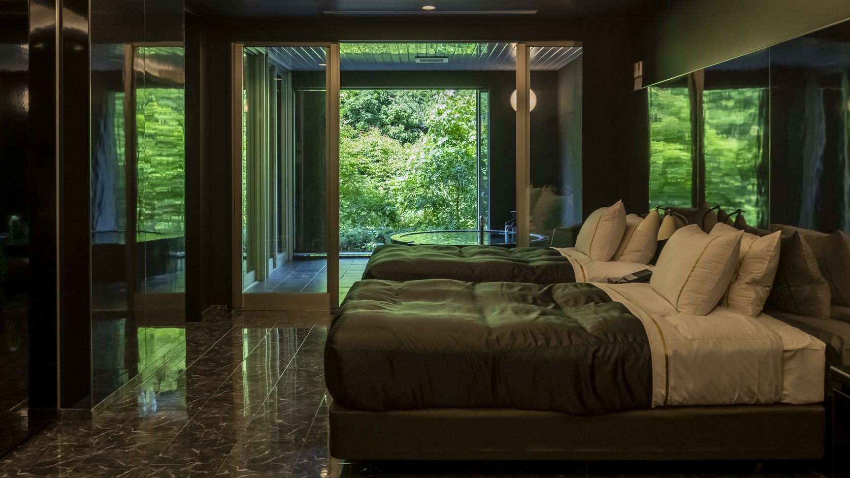 全室露天風呂付客室のスイートルーム。ベッドは深遠な眠りを誘うシーリー社製。洗練された空間とデザイナーズ家具に加え、世界的ブランド「アンリアレイジ」による特別なオブジェやスリッパが空間を彩ります。