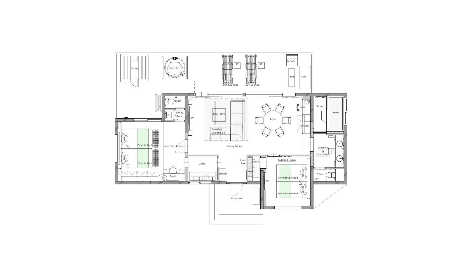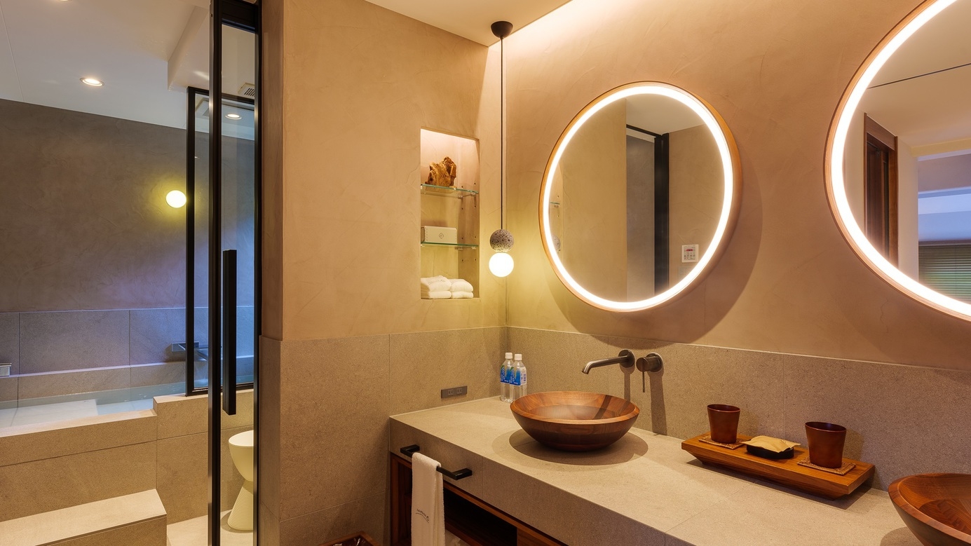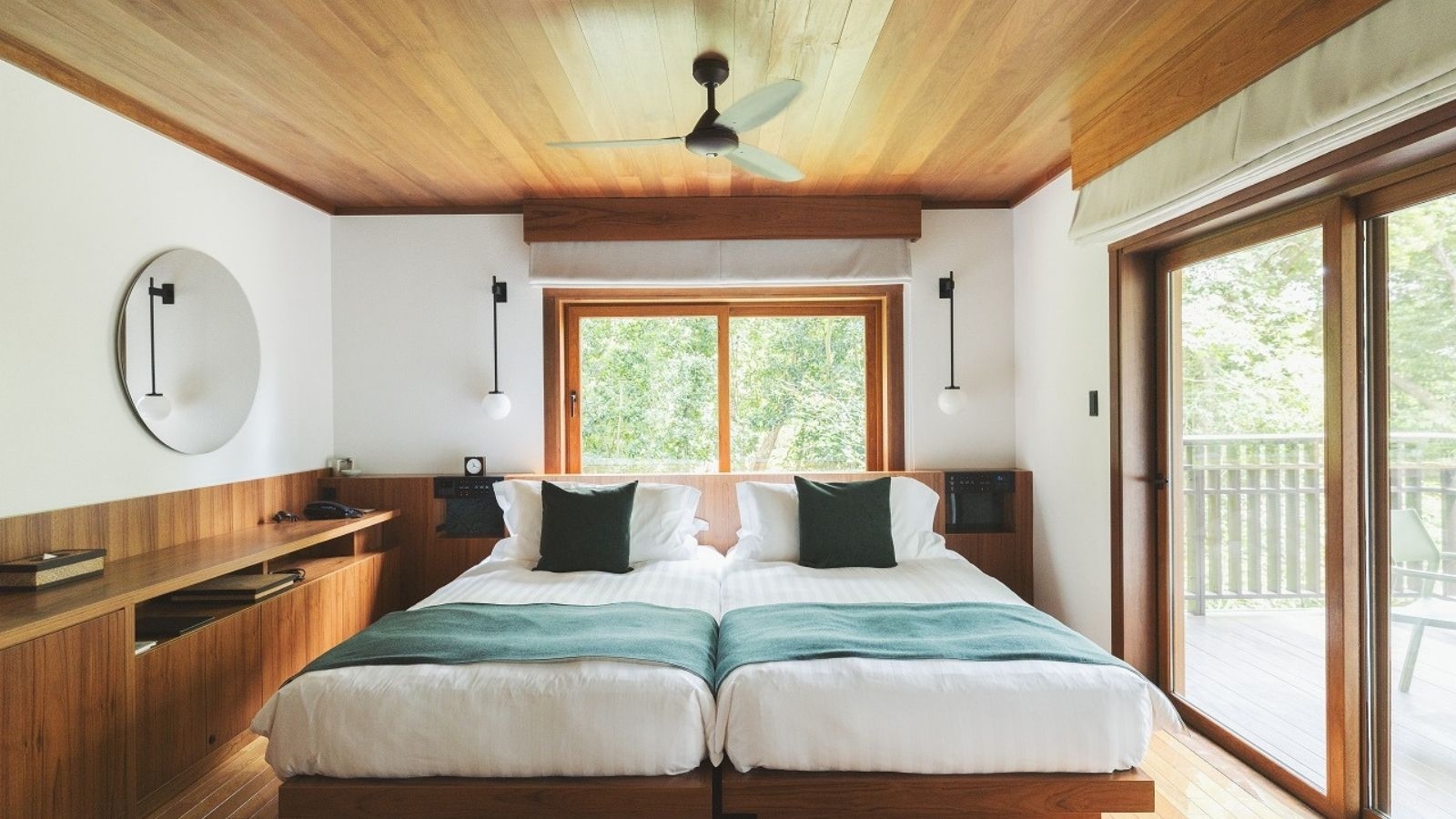 森と海を望むバルコニーにプライベートサウナを備えた、サンカラ ヴィラスイートでは、心と体を解きほぐす豊かな時間をお過ごしいただけます。
