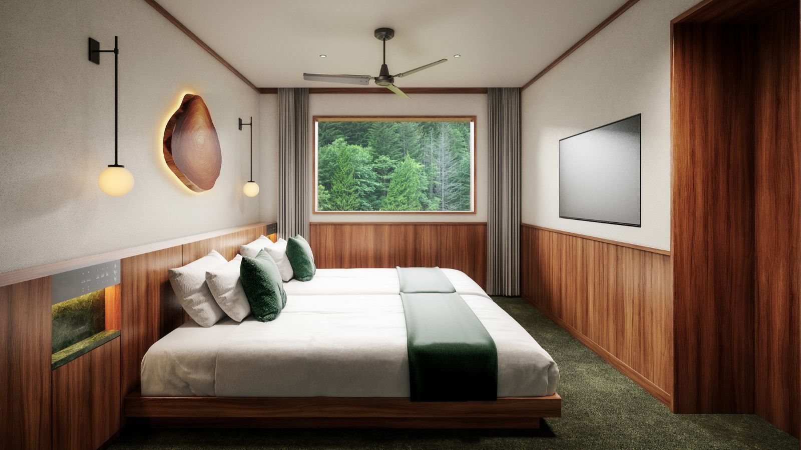 2026年4月全面リニューアル。海を望むジュニアスイートは、寝湯付き24時間利用可能なバスを新設。自然素材のモダンな空間で、屋久島と調和する上質な滞在を。