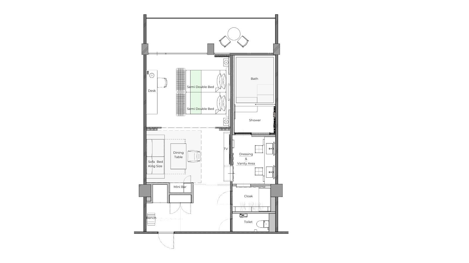 本館内にある最高級スイートルーム。客室でトリートメントを受けられるインスパルームと、アウトバスを設置。アクティビティの疲れも、自室で癒して頂けます。