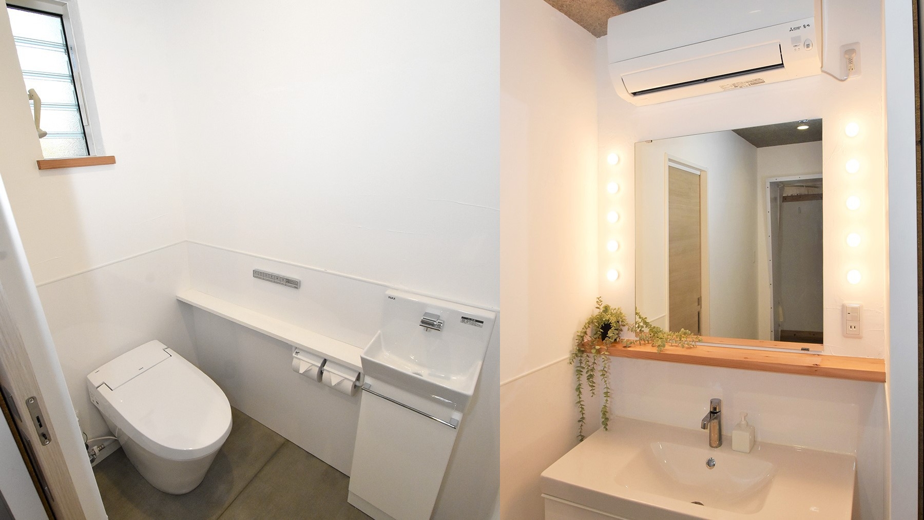 冷暖房エアコン・洗面台・トイレットペーパー・ハンドタオル・ハンドソープ・ボディソープ・シャンプー・コンディショナー