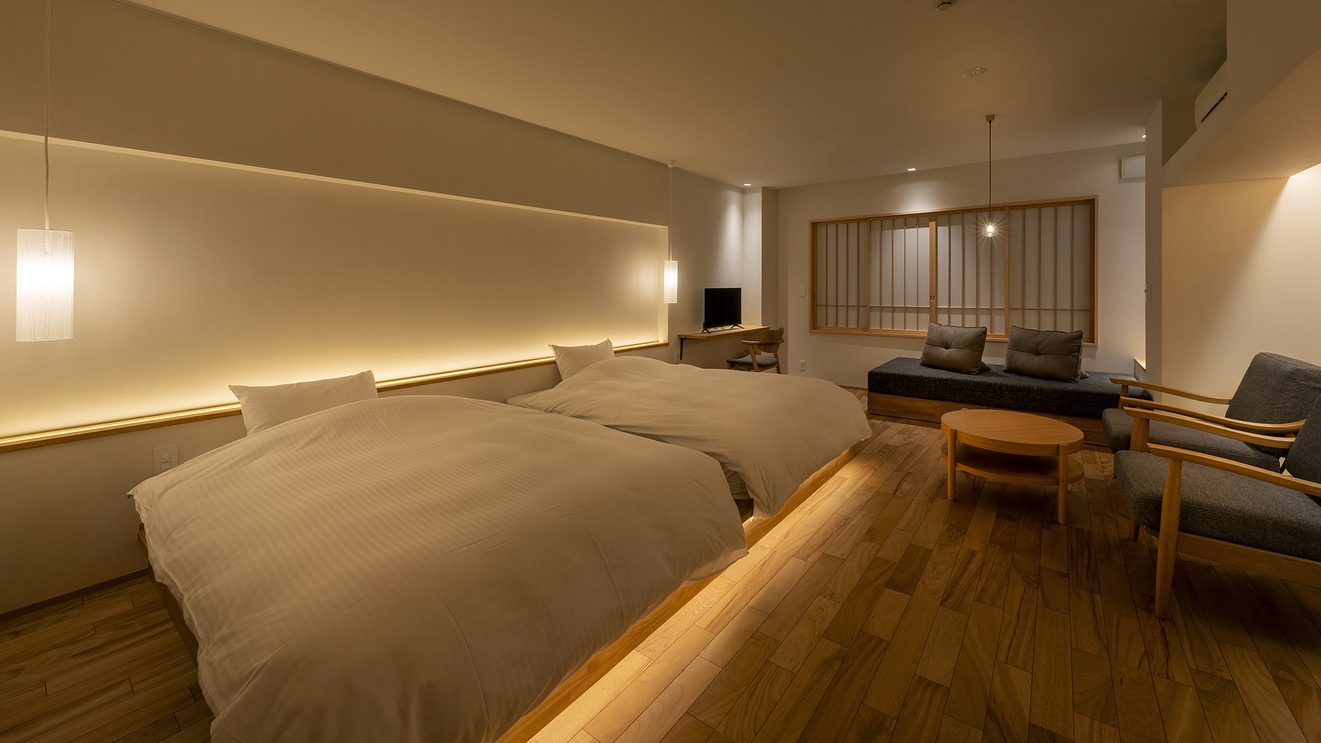 瑞雲山を背にする当館の最上階。 山間の温泉地を眺望する客室。 ダブルベッドのツインルームに、カウンターと窓際にはソファをご用意。 静かな空間でくつろぎのひと時を