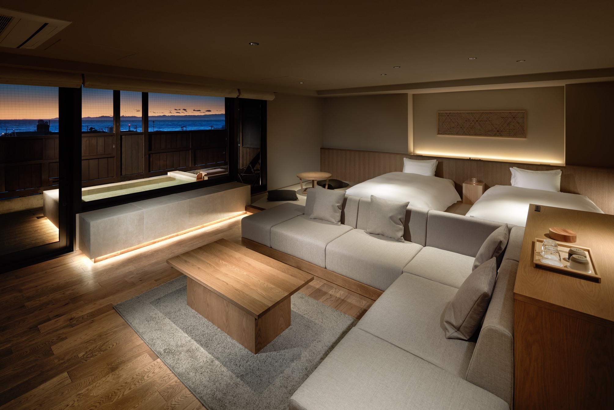 54平米の和室にセミダブルベッドを2台ご用意。ベッドを繋げてハリウッドツインも可能。西伊豆ステイを気軽に楽しみたい方に。※3名ご利用時はお布団