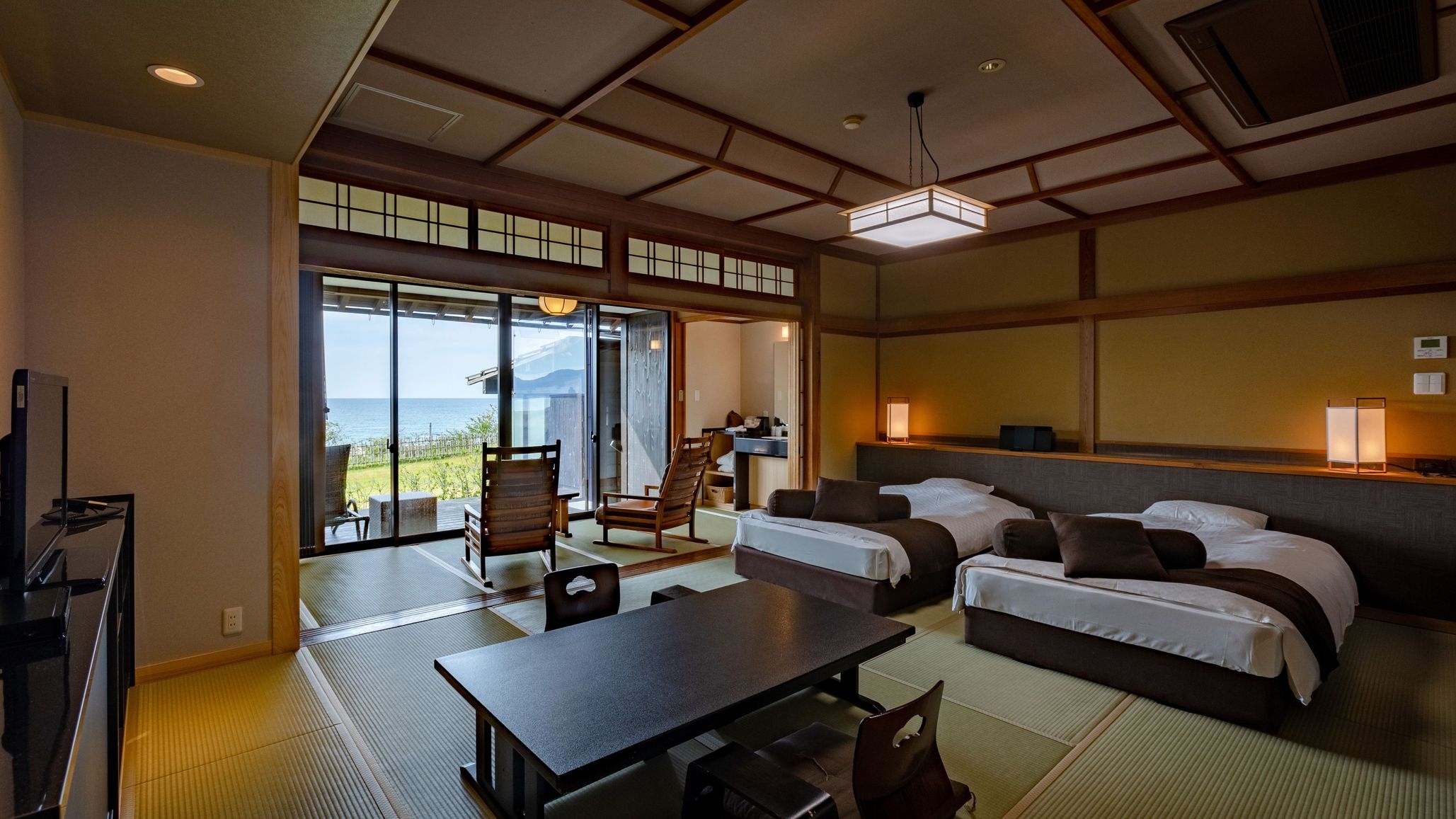 【全室禁煙】オーシャンビュー(1階)・セミダブルベット付の和室(約55平米)・海を眺める温泉露天風呂付・ベッドは2台、3名利用は1名布団