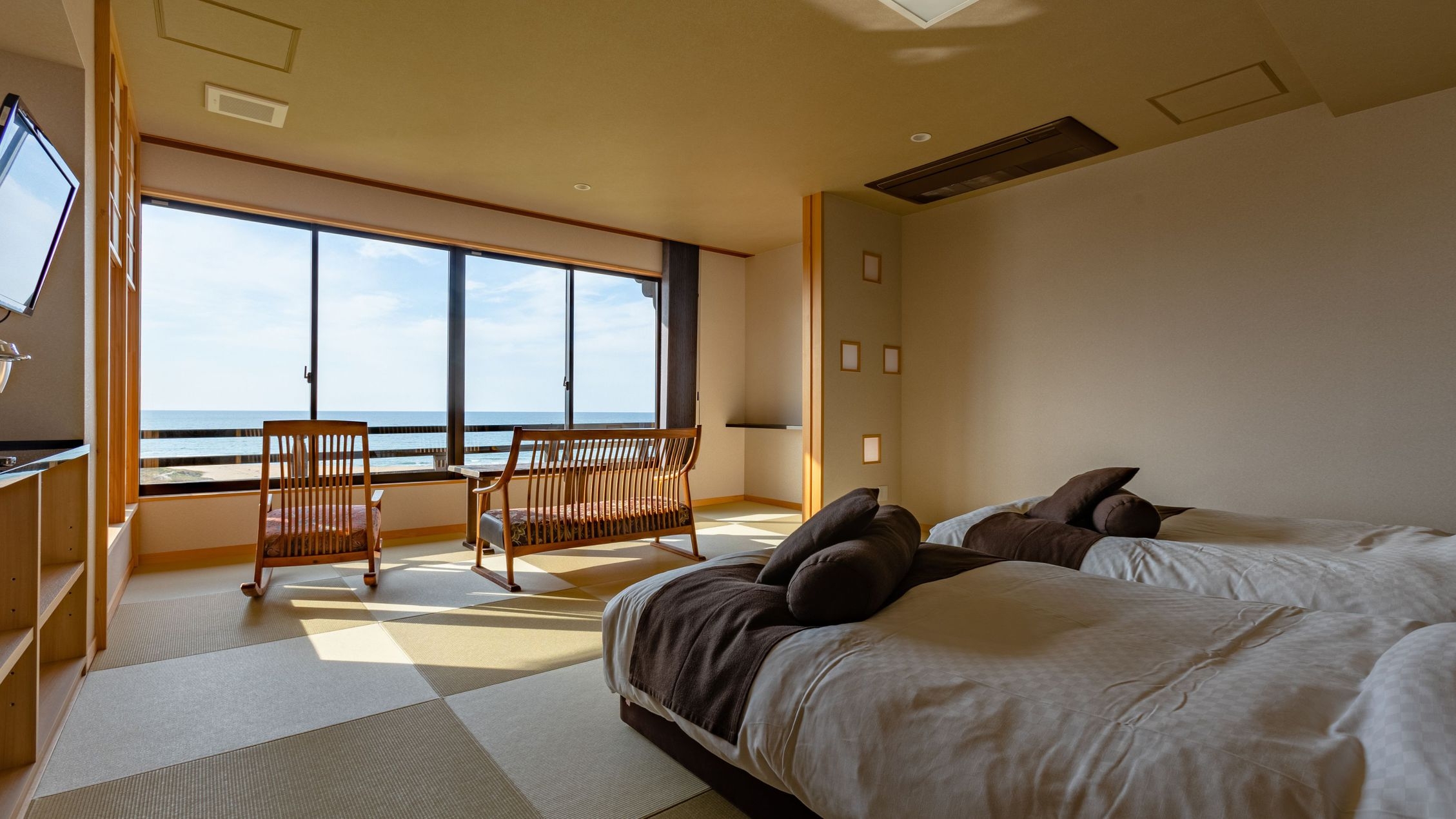 2024年7月リニューアルオープン【全室禁煙】オーシャンビュー(3階)・セミダブルベット付の和室(約47平米)・温泉展望風呂付・ベッドは2台、3名利用は1名布団