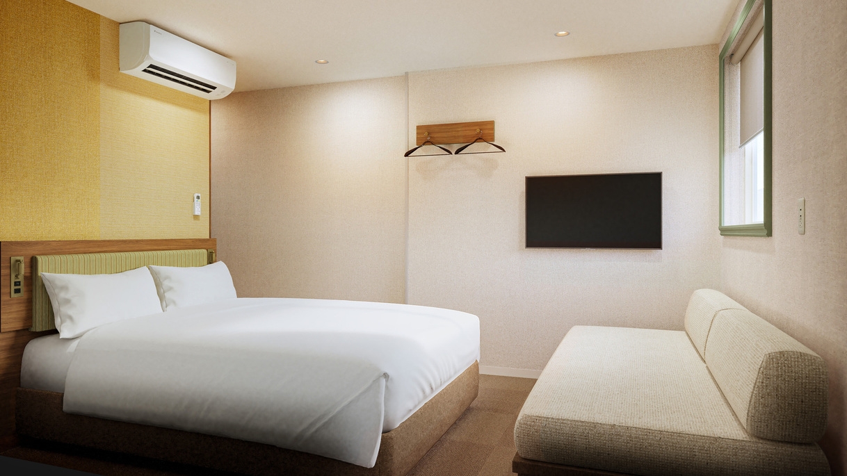 2026年7月リニューアル予定!ダブルベッド1台、ソファベッド1台の洋室です。 3名様まで利用可能。※バス・トイレ:ユニットバス