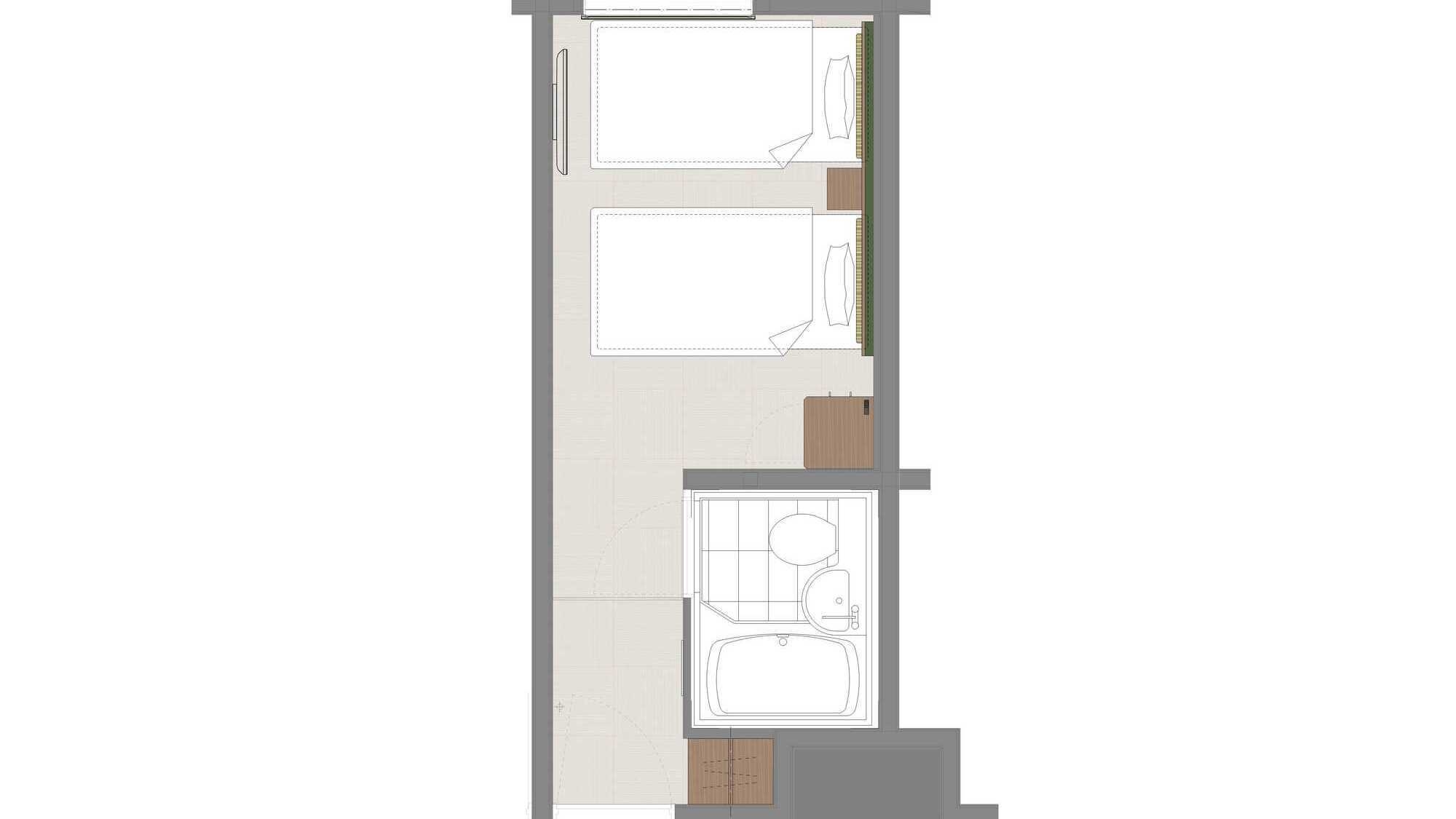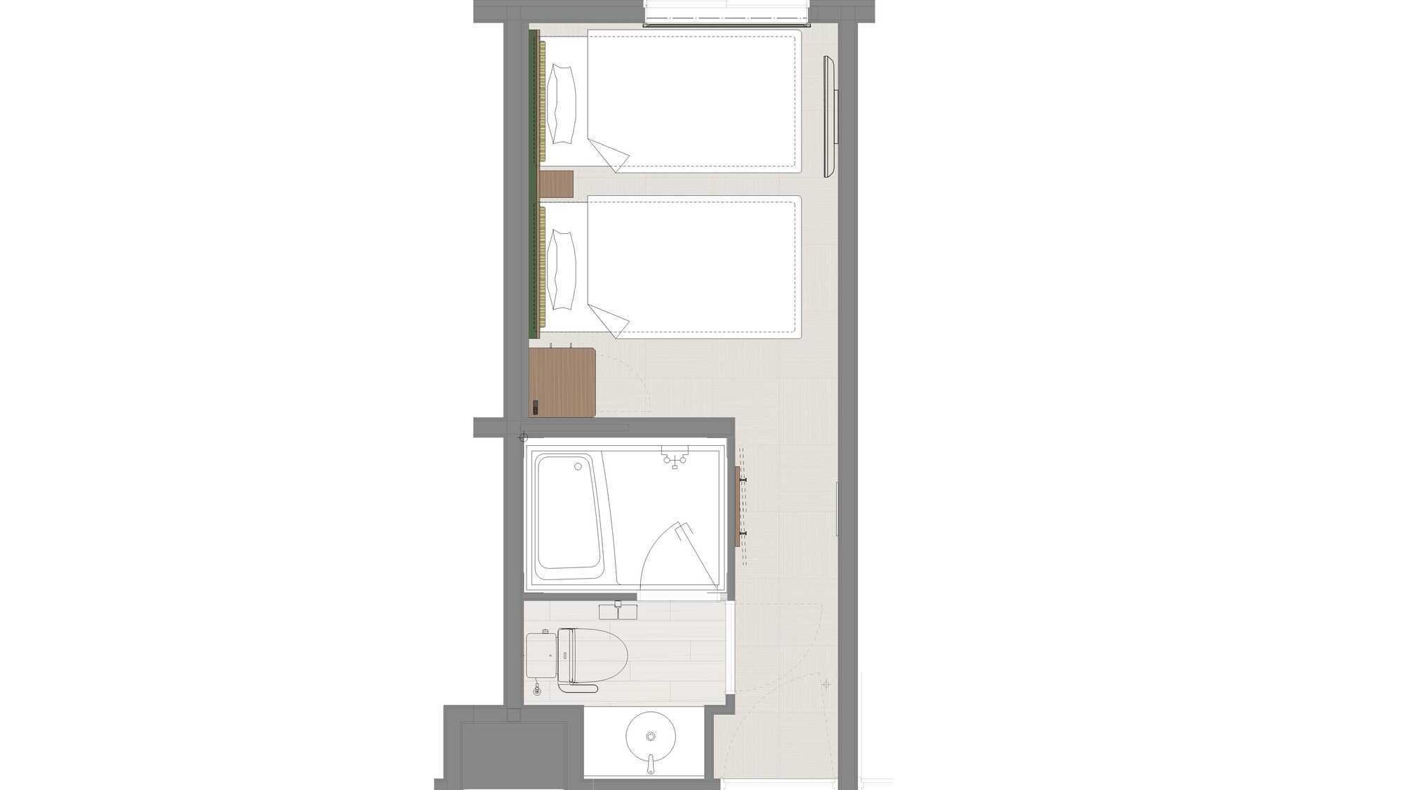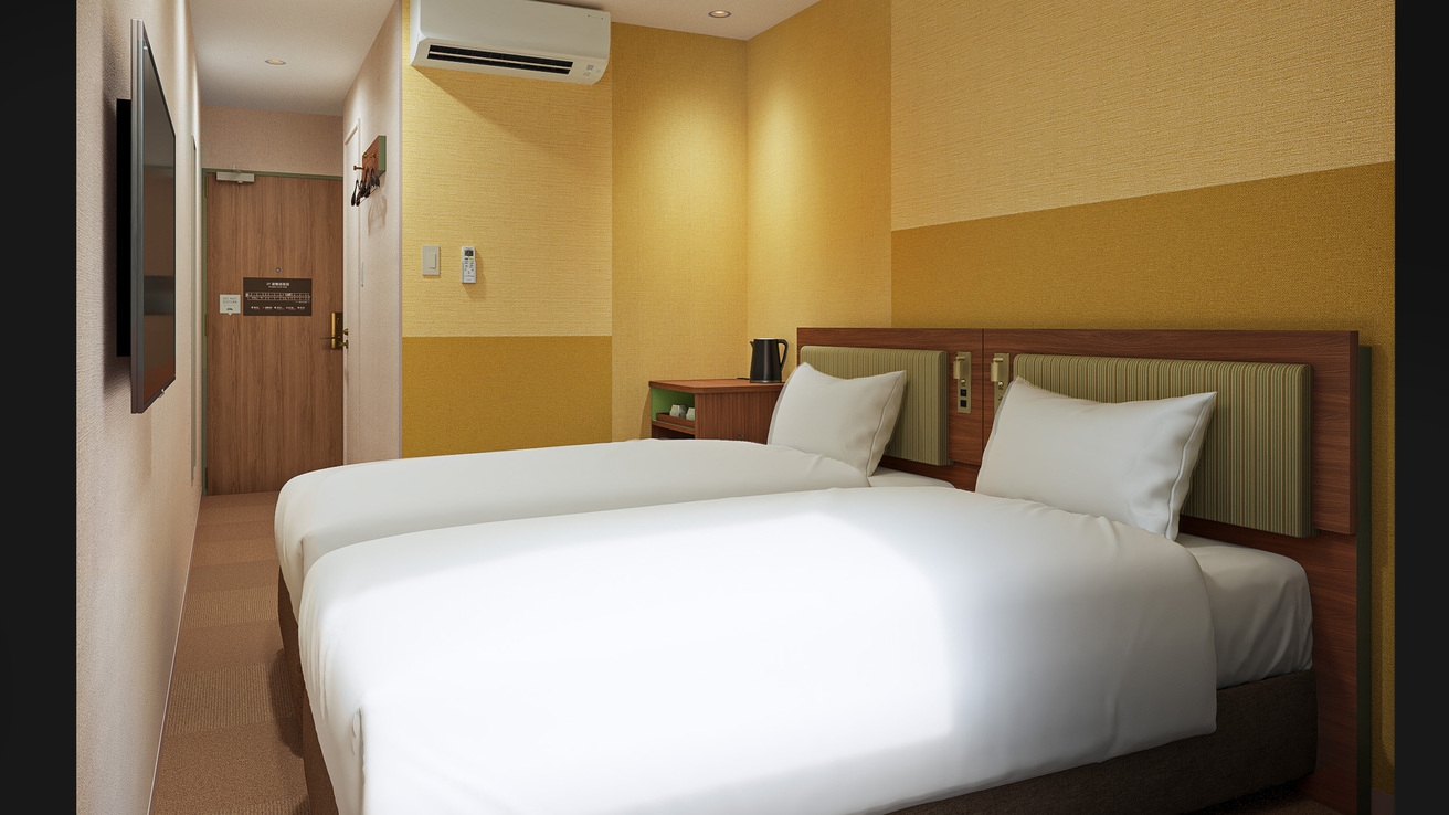 2026年7月リニューアル予定!シングルベッド2台の洋室です。 2名様まで利用可能、バス・トイレ別。