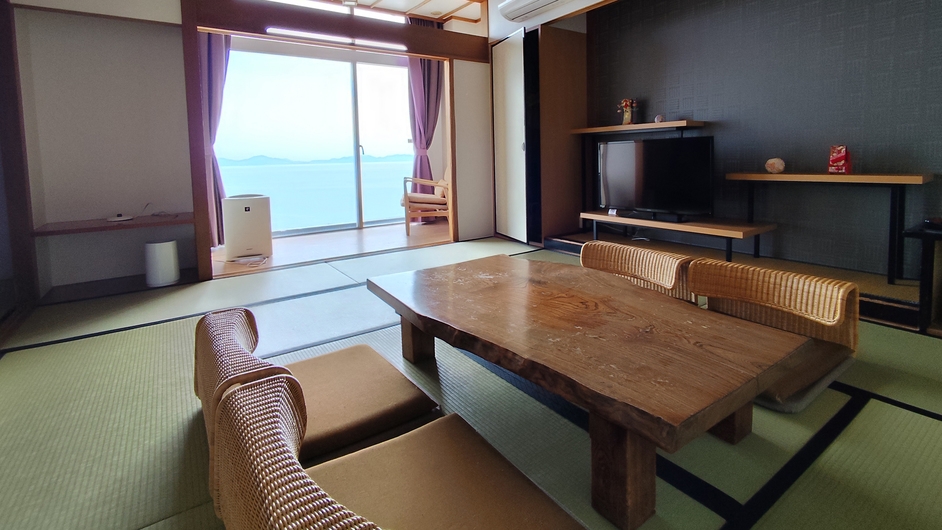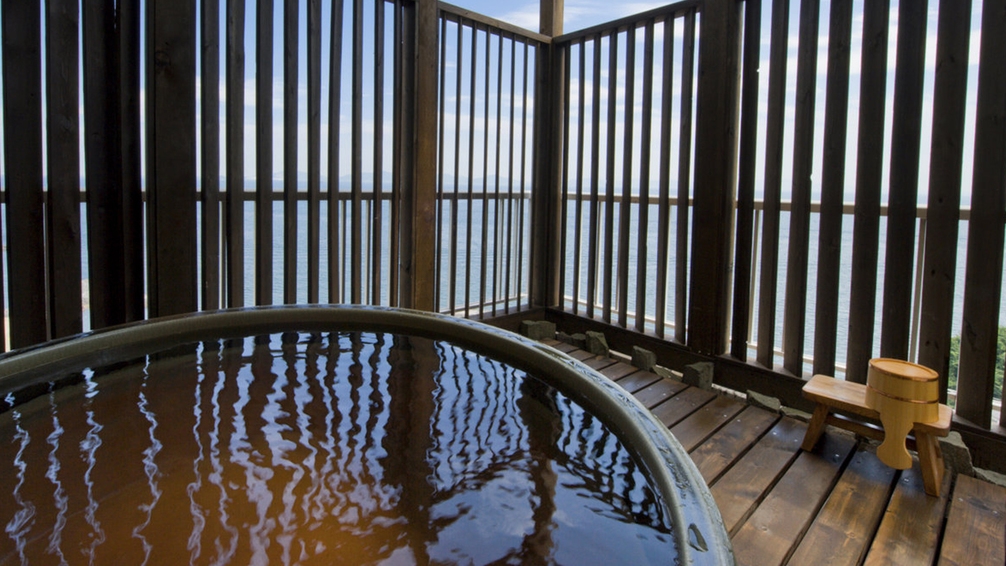 トラディショナルな和の趣きで、解放感のある窓からは三河湾をパノラマで一望できるお部屋です。露天風呂(非温泉)付で、よりプライベートな時間をお過ごしいただけます。