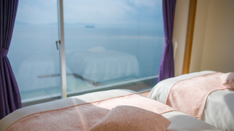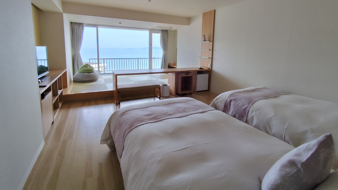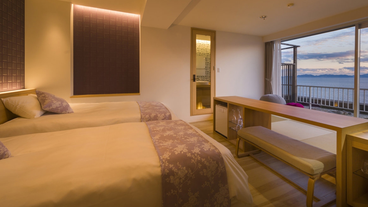 機能性とデザインを追求した、ツインベッドを備えた和洋室です。和の情緒を感じつつベッドでお休みいただけます。「花かざし」は全室オーシャンビューです。
