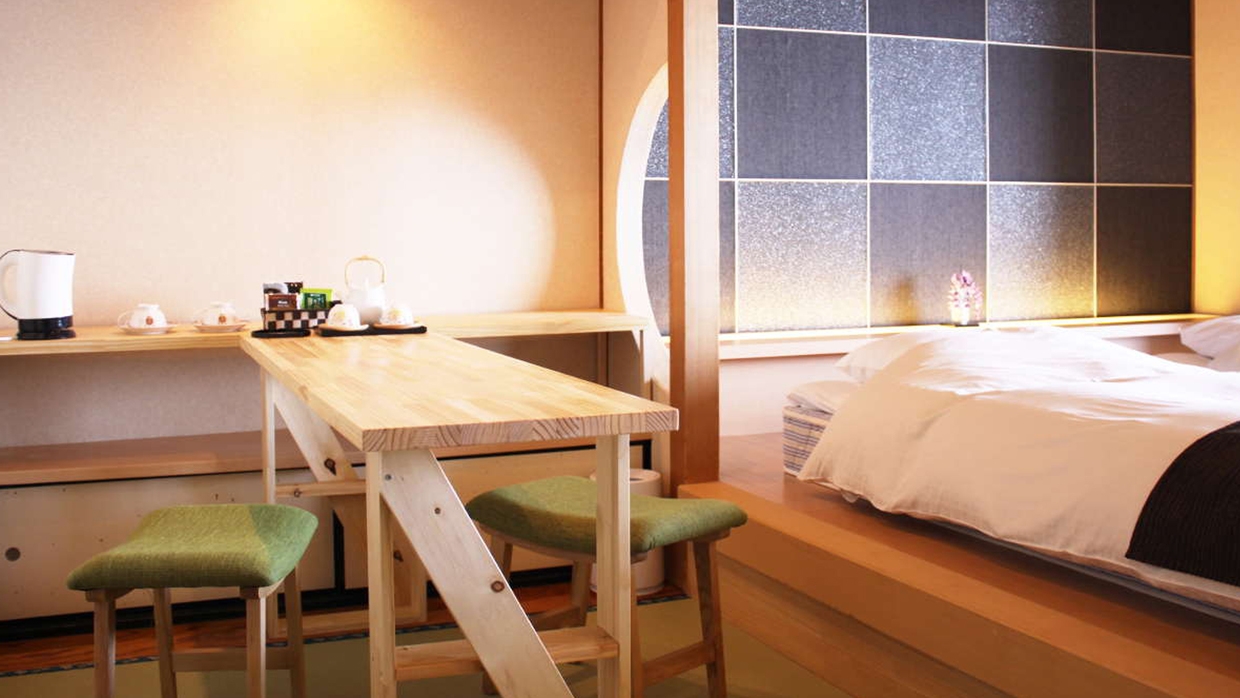 寛ぎの和室とは別に、ツインベッドの洋室のある二間の和モダンルームです。広くゆったりお過ごしいただけます。二間あるのでお連れ様より遅めの就寝も気兼ねなくできます。