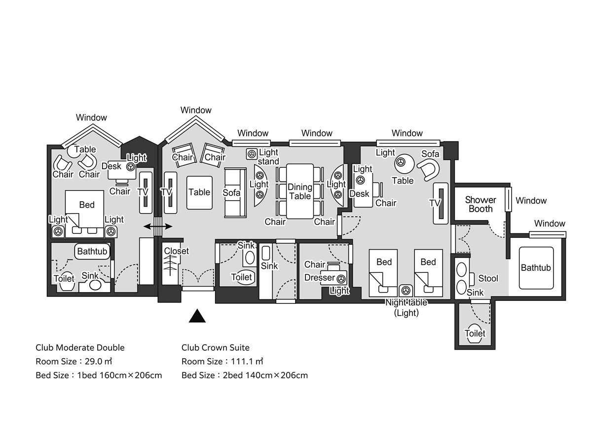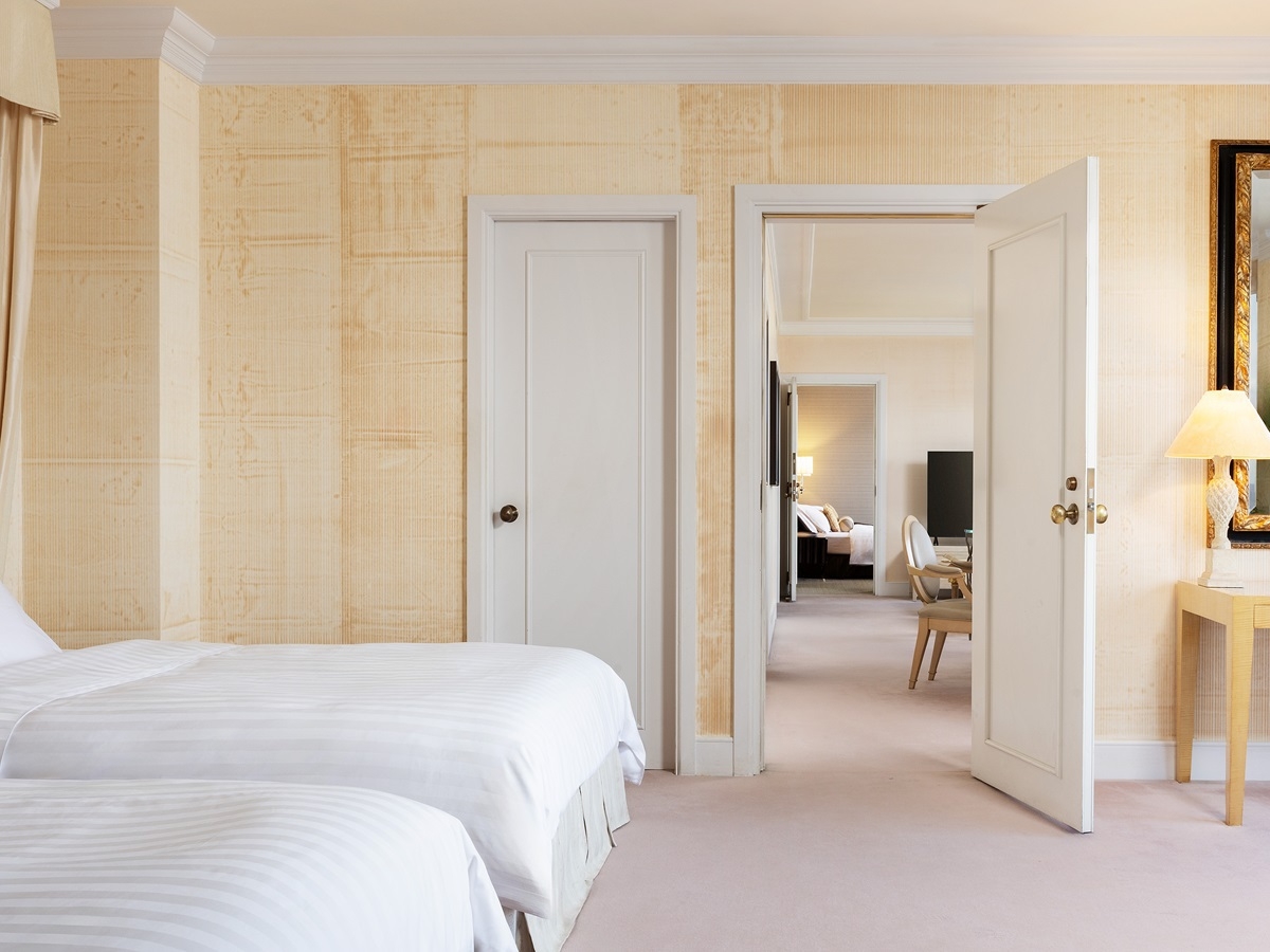 ホテル最上階のクラブフロアに位置するスイートルームと隣接するモデレートダブルを室内扉でつないだ、最大4名様までご利用可能なコネクティングルームです。