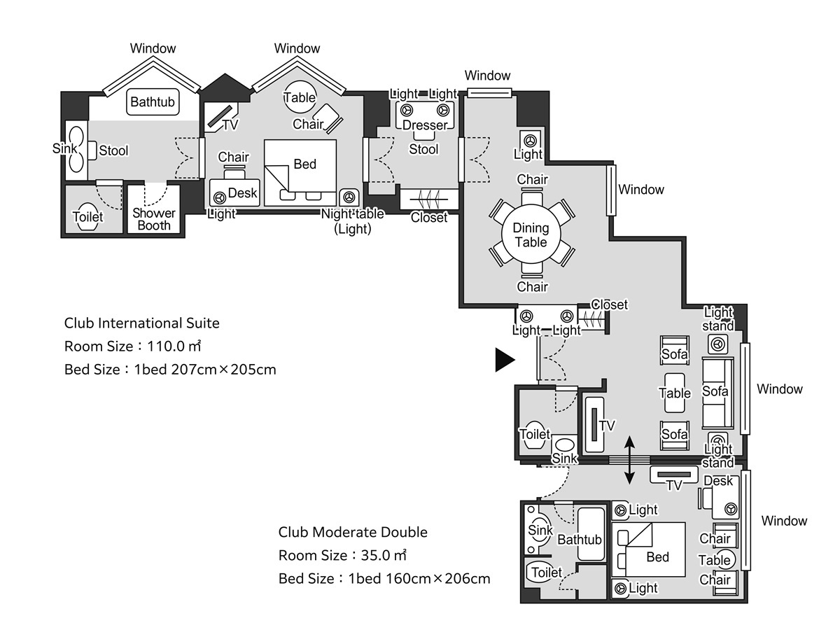 【禁煙】クラブインターナショナルスイート(110平米)とクラブモデレートダブル(35平米)のコネクティングルーム※2室合計のベッド数:2台★フロア特典有