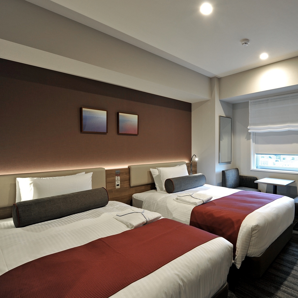 ◇小学生以下2名まで添寝無料◇バストイレ別・洗面台が独立◇シモンズ社製の110cm幅ベッド2台・加湿空気清浄機・ホット便座・無料Wi-Fi・40型液晶テレビ完備