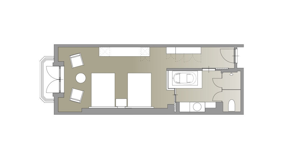 本館2F-3Fに位置するワンランク上のバルコニー付ツインルーム。ベッド2台を並べたハリウッドツインタイプの客室です。シモンズ社製ベッド(幅140cm×2台)