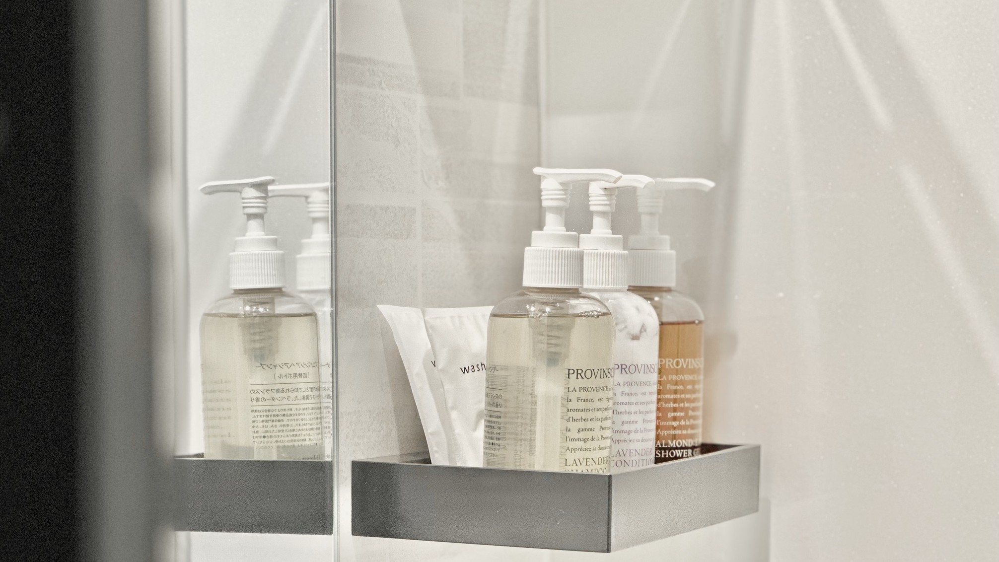 フェイスタオル、バスタオル、ガウン、ドライヤー、充電器、テレビ、DVDプレーヤー、電気ケトル、冷蔵庫、スタンドライト、マグカップ、ガラスコップ、卓上鏡、シャンプー、コンディショナー、ボディソープ