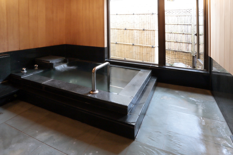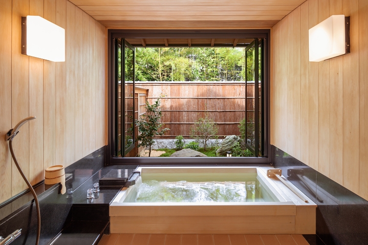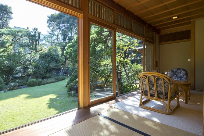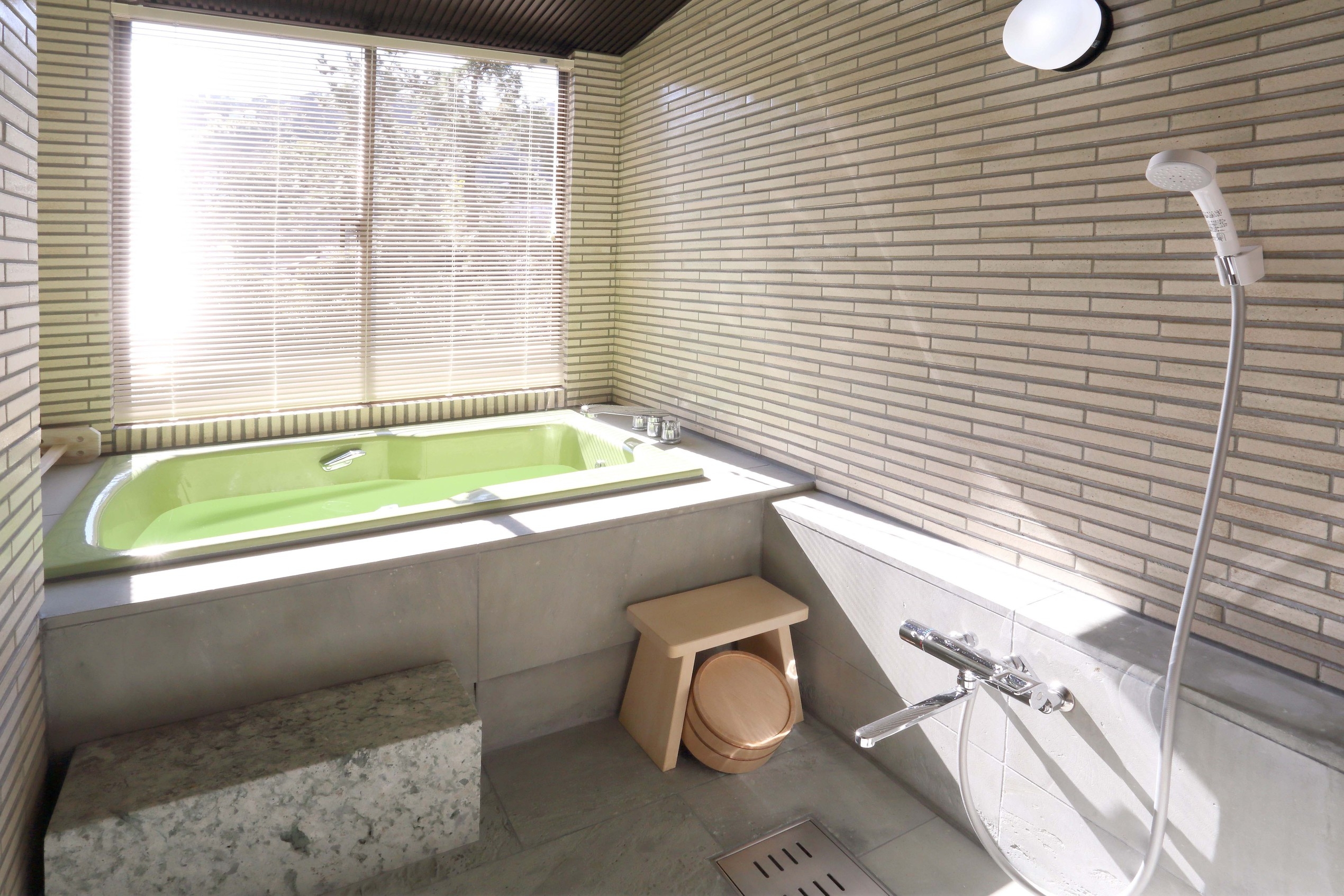ウォシュレットトイレ/源泉掛け流しの温泉風呂付。お部屋でゆっくりと熱海の名湯をお楽しみください。庭園をめぐる離れは数奇屋の粋を凝らしております。