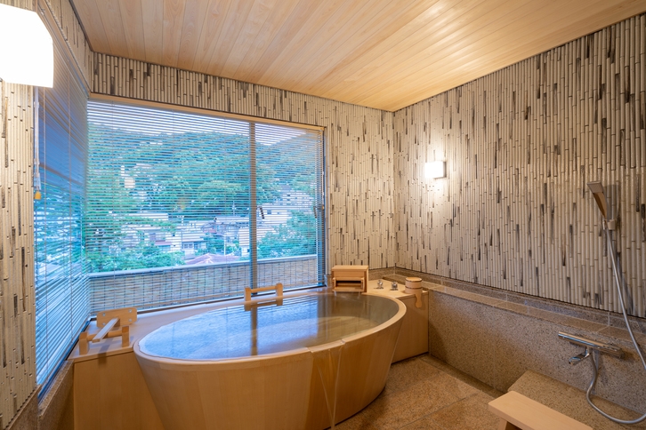 ウォシュレットトイレ/源泉掛け流しの温泉ひのき風呂付。お部屋でゆっくりと熱海の名湯をお楽しみください。当館最上級の和のやすらぎをご提供いたします。