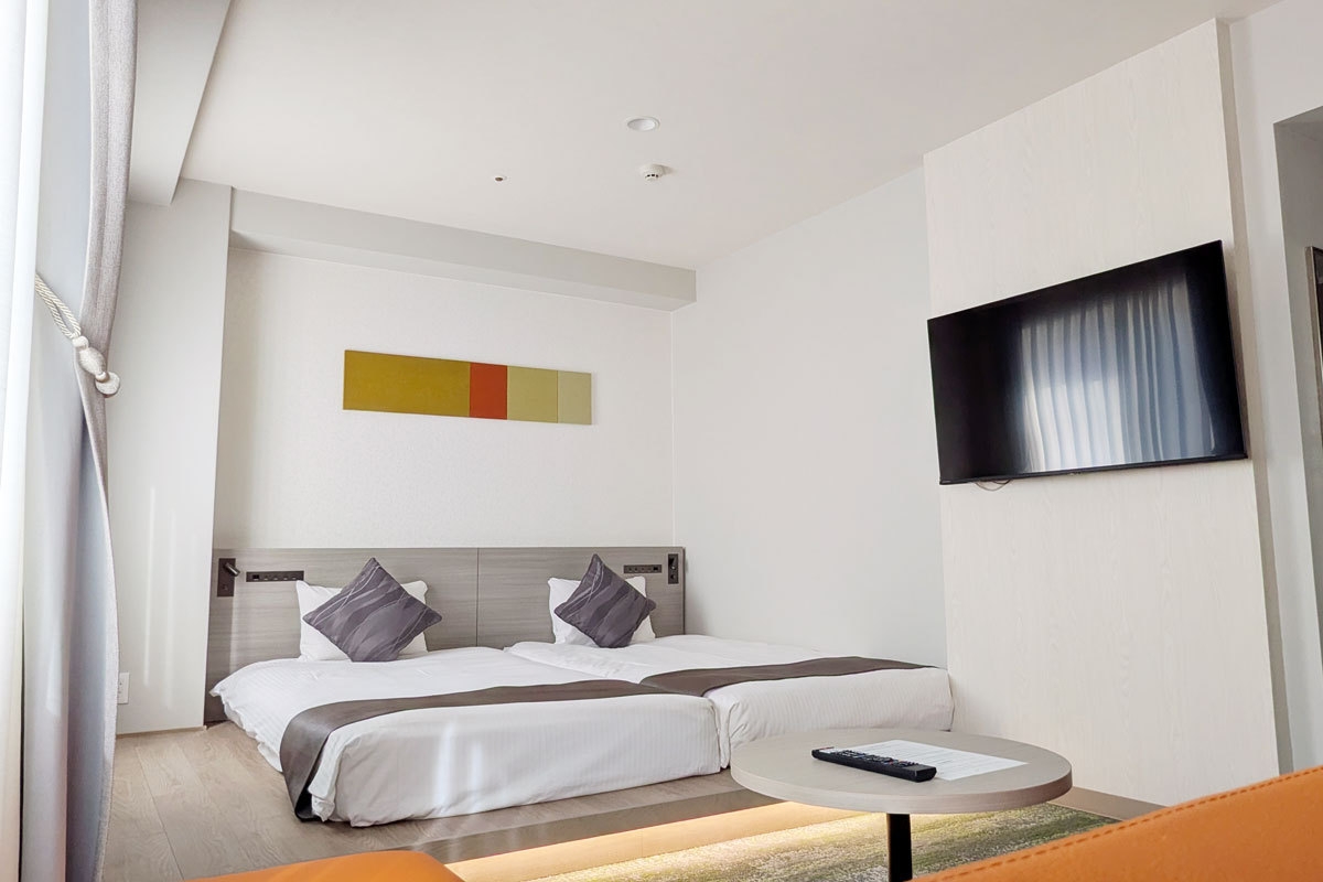 くつろぎの室内空間へリニューアルいたしました。 全室シモンズ社製ベッドを採用。25.6平米に1200mmと1100mmベッドを2台繋げたハリウッドツインタイプ。