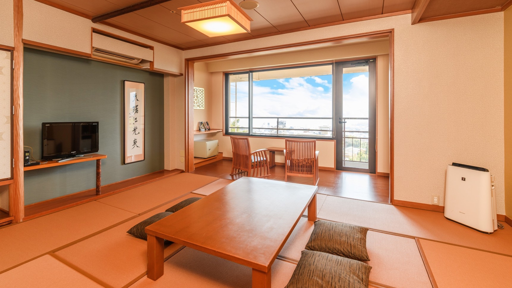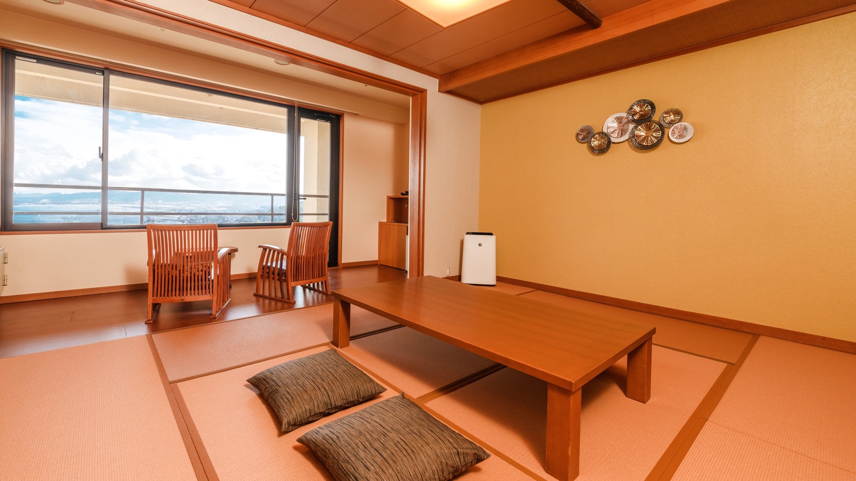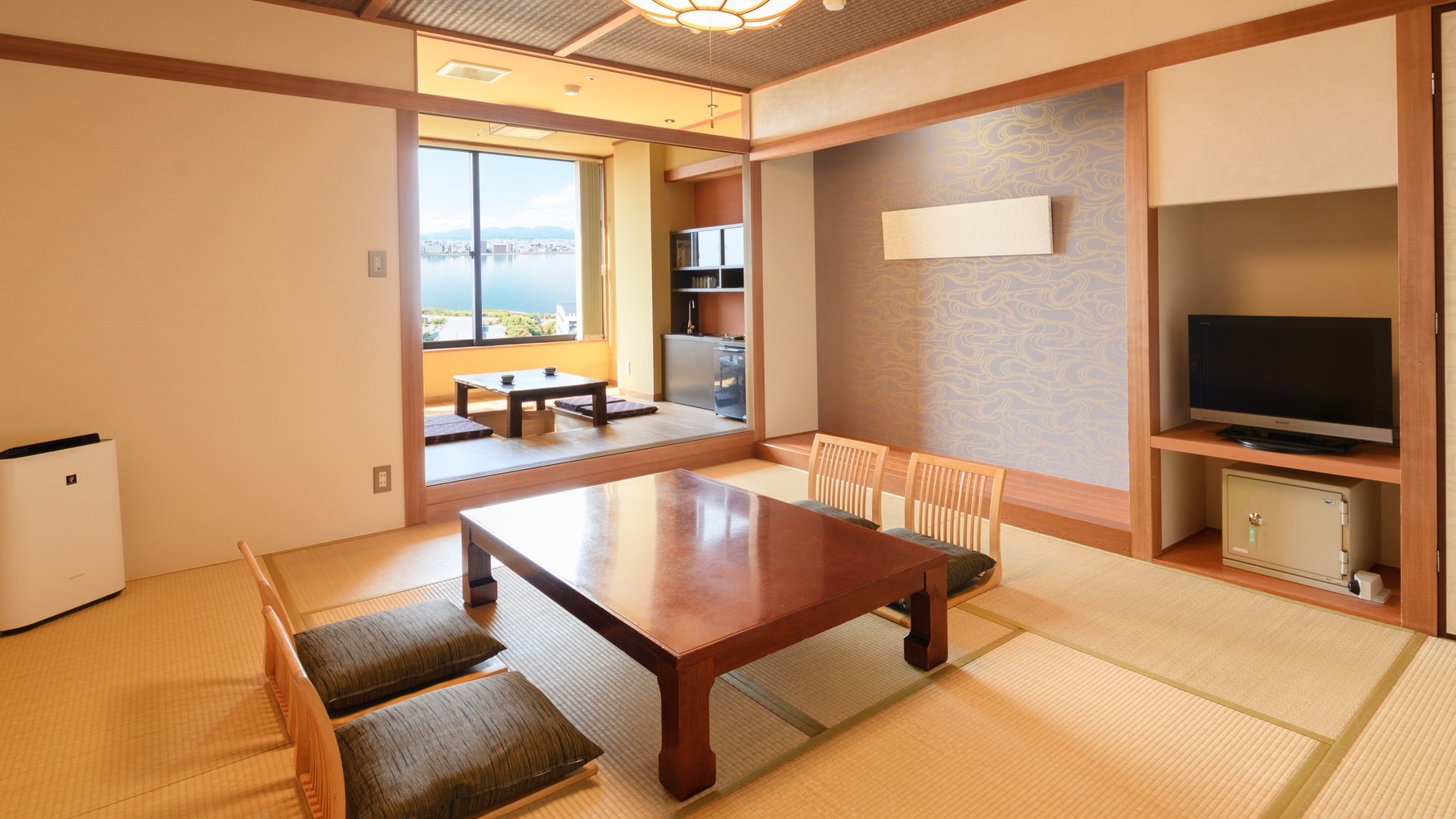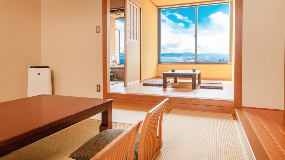 10畳の和室と掘りごたつ形式の部屋、露天風呂が付いた日当たりの良い客室です。 露天風呂からは雄大な琵琶湖の景色、夜は夜景を楽しんでいただけます。